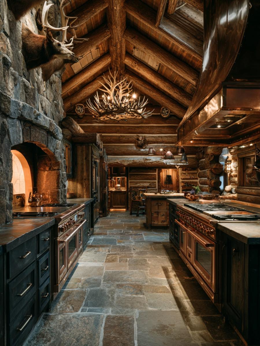 This sprawling cabin kitchen features stacked-stone structures, thick beams, and warm natural finishes that amplify its scale. The rustic materials give the space a lodge-like presence that feels both dramatic and inviting. It’s an expansive, luxurious take on cabin living.