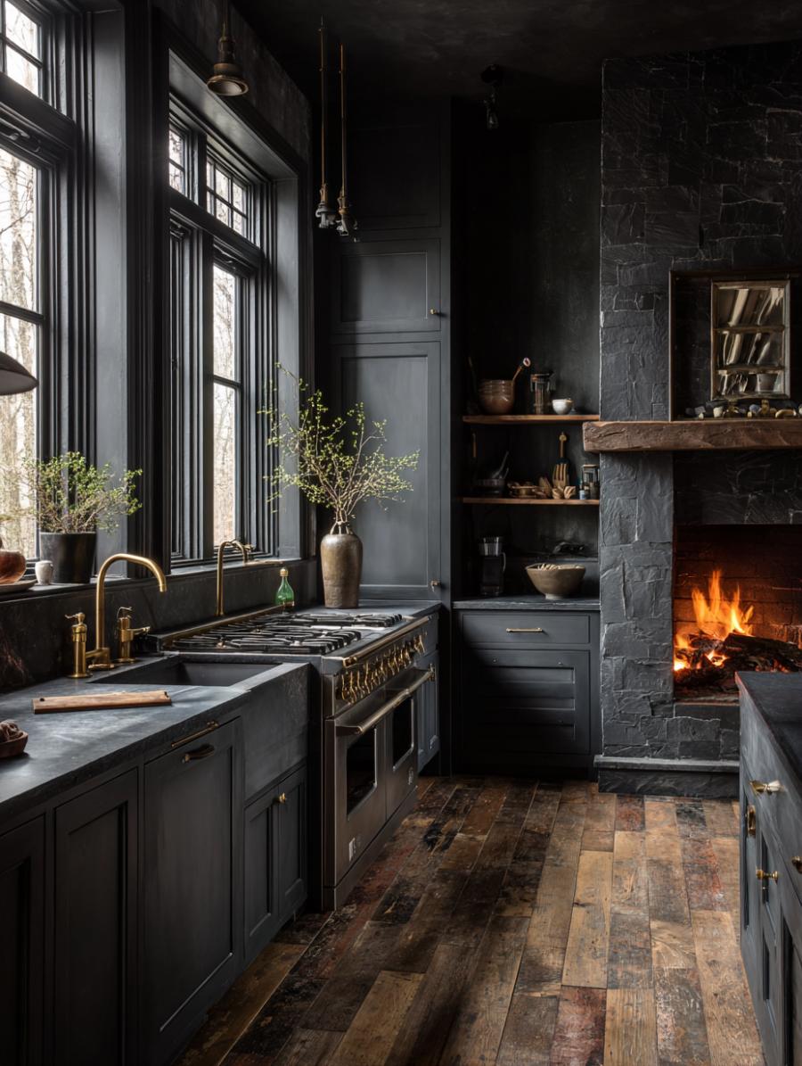 Moody Rustic Kitchen with Matte Charcoal Cabinetry and Timber Accents