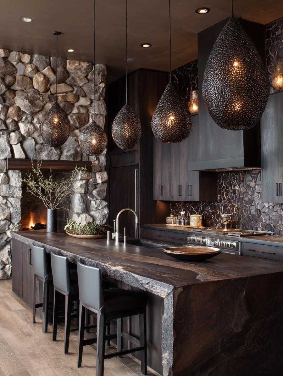 This rugged-luxe kitchen marries leathered stone countertops, rich timberwork, and moody lighting to create a dramatic rustic atmosphere. The tactile finishes add depth and character, giving the space a bold yet luxurious presence. It’s rustic refinement at its most expressive.