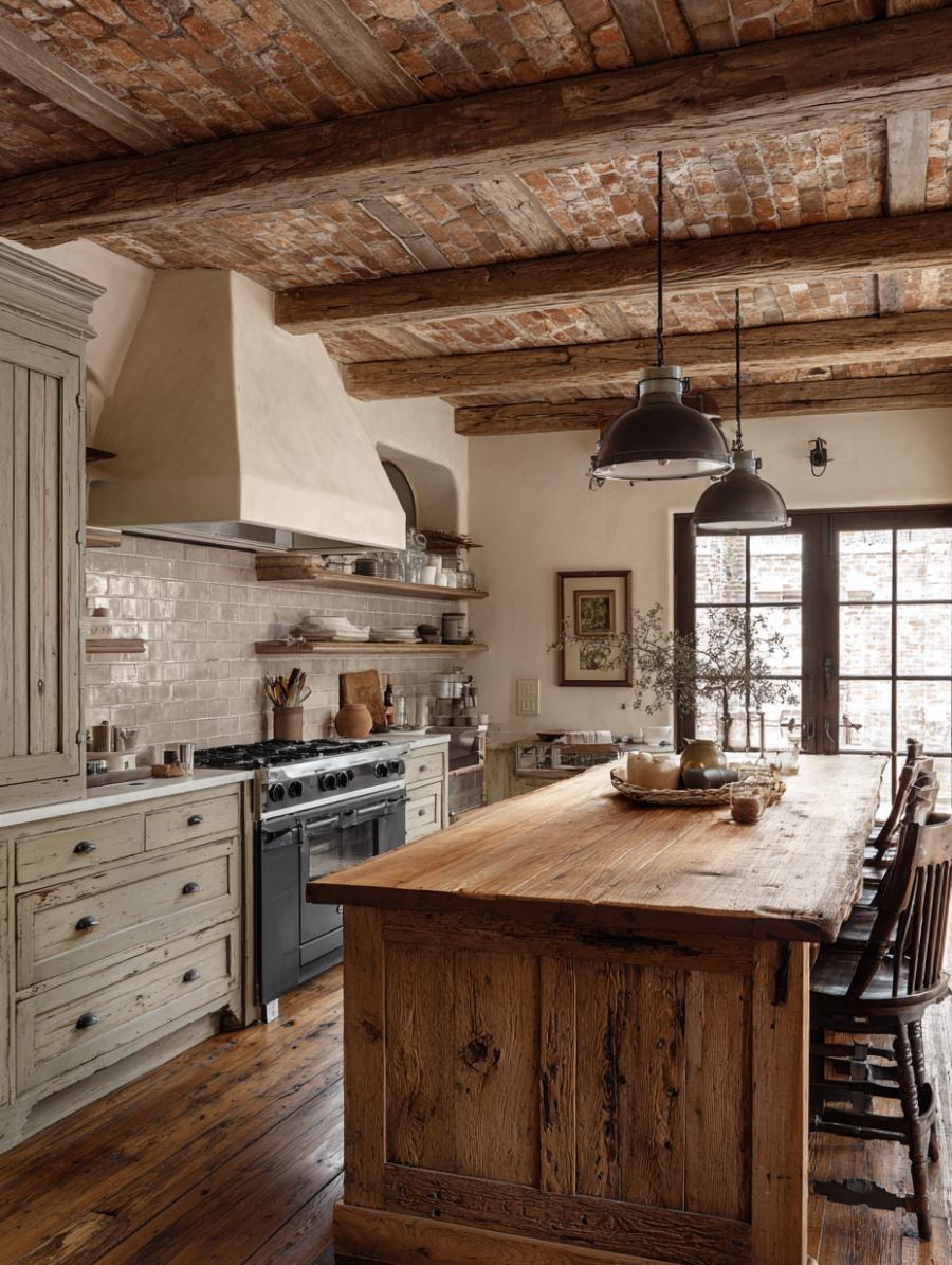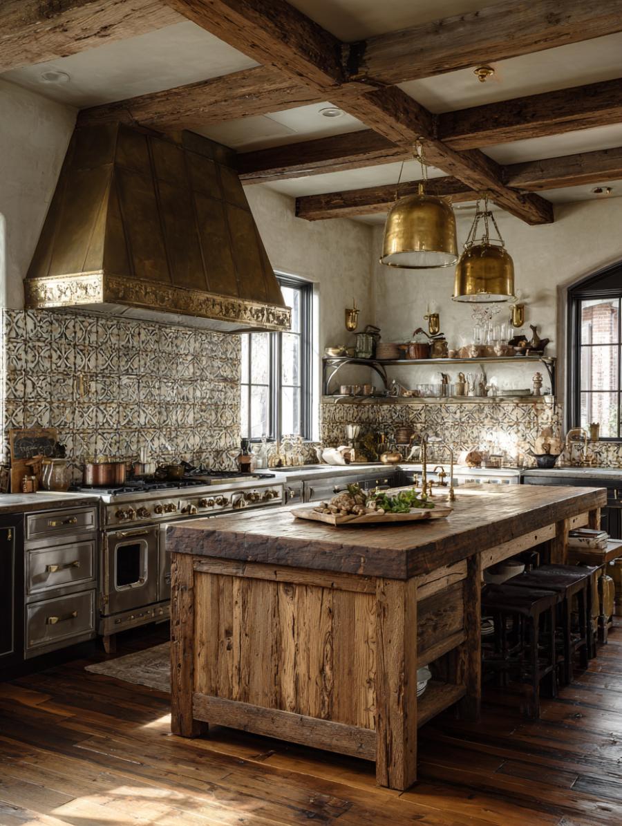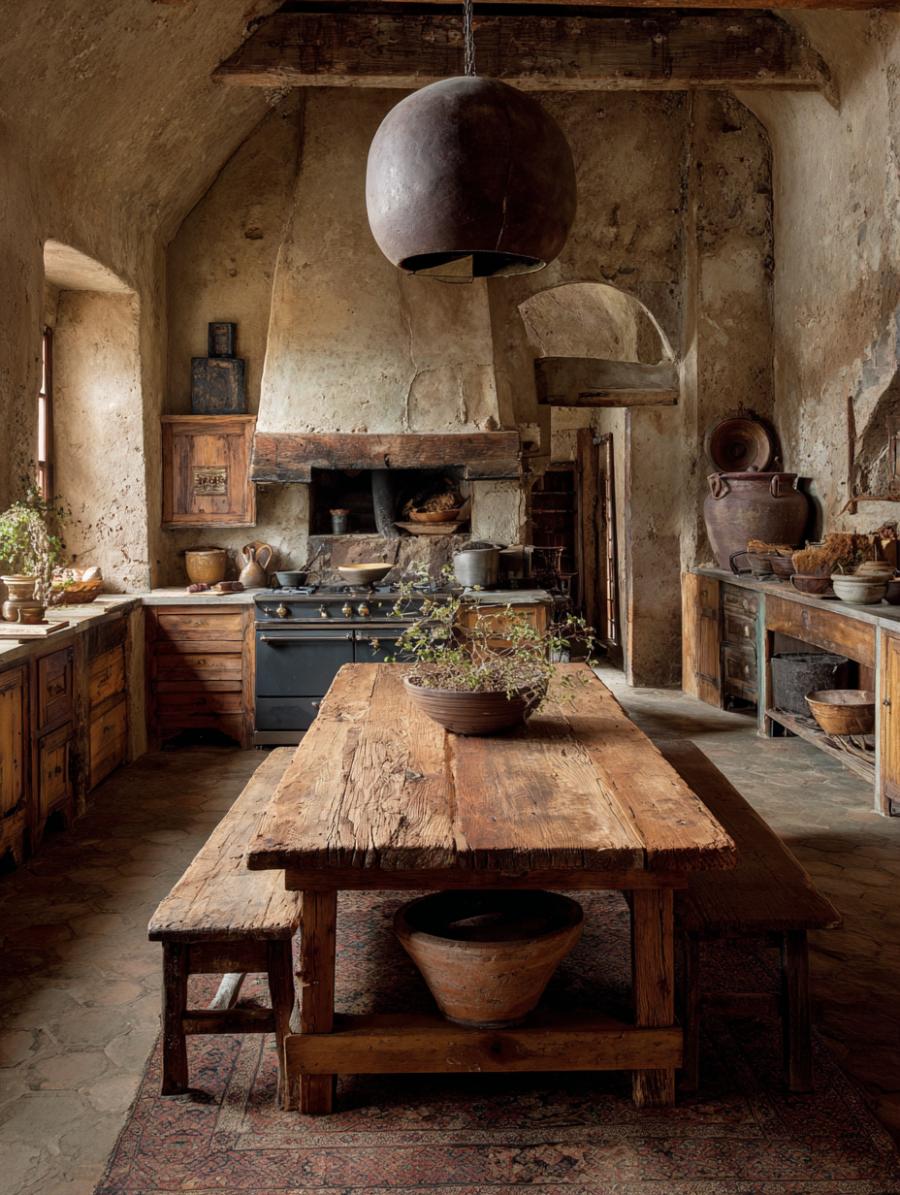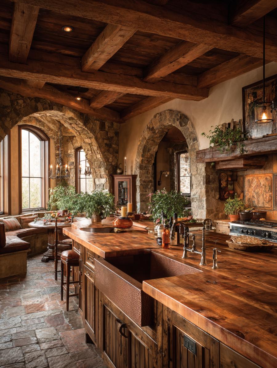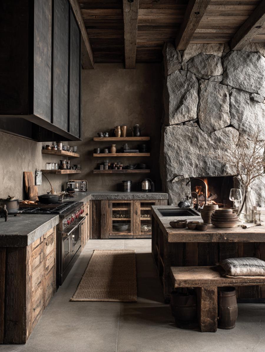 This kitchen showcases reclaimed timbers, rugged stonework, and warm hues that create a refined rustic atmosphere. The stone hearth-like structure becomes a natural focal point, giving the space a sense of grounded luxury. Every element feels intentionally weathered yet beautifully curated.