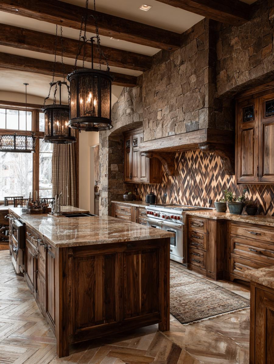 This rich rustic kitchen features luxurious walnut cabinetry paired with textured stone accents for a warm, grounded feel. The deep tones give the room a lush, enveloping atmosphere, while the stonework adds natural rugged beauty. It’s both elegant and authentically rustic.