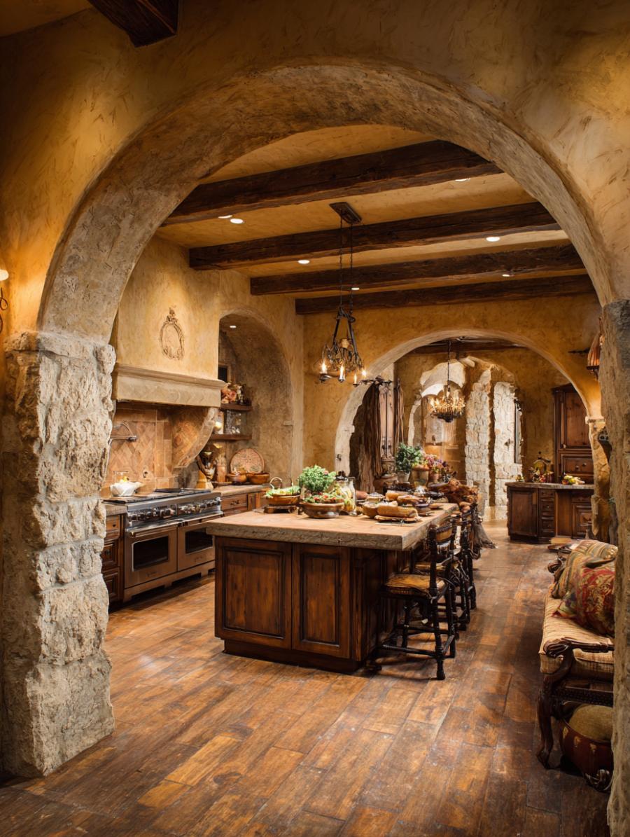 Here, hand-carved wood cabinetry is paired with rugged stone accents to create a kitchen that feels both ancient and luxurious. The warm tones and textured surfaces invite a sense of history, while modern lighting refines the look. The result is a soulful cooking environment with emphasis on craftsmanship and natural beauty.