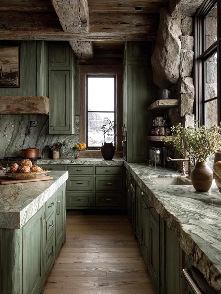 Serene Nature-Inspired Rustic Kitchen with Mossy Green Accents