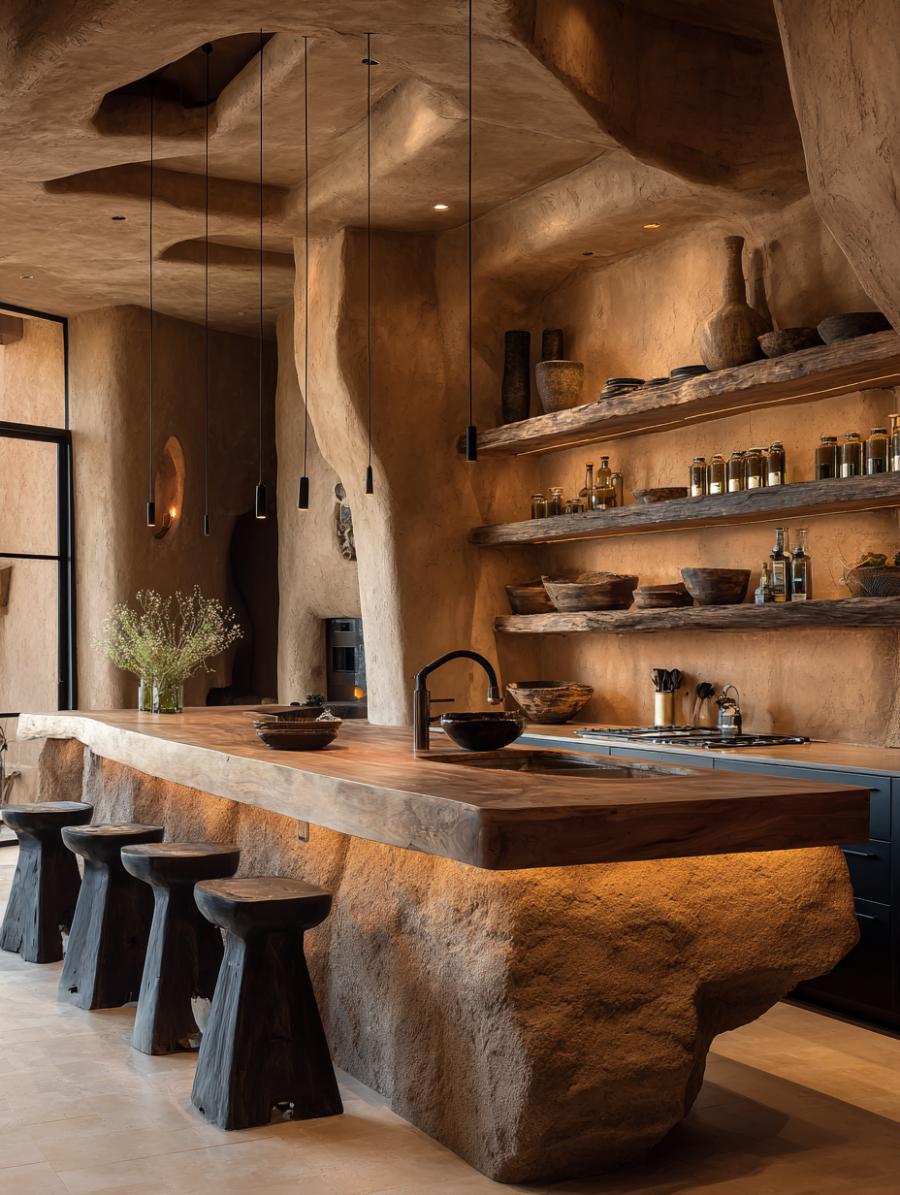 This canyon-inspired kitchen pairs sculptural stone elements with warm wood textures to evoke the drama of carved desert landscapes. The rugged surfaces and deep natural tones create an immersive, earthy feel. It’s a bold environment that celebrates raw beauty and high-end rustic design.