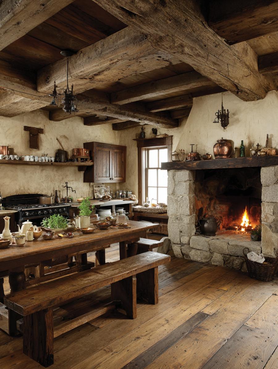 Rustic Luxury Kitchen with Reclaimed Timbers and Stone Hearth