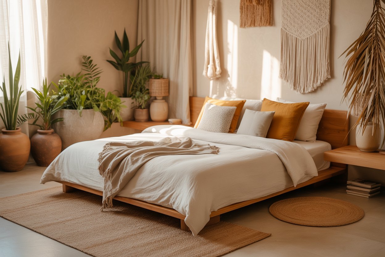 Macramé’s knotted construction adds dimensional texture through shadows and geometric patterns created by natural cotton rope. Whether as wall hangings, plant holders, or headboard accents, this handcraft technique introduces what I describe as “meditative texture”—patterns created through repetitive, mindful action. The neutral tones of natural cotton fiber integrate seamlessly with earthy palettes while adding bohemian warmth without excess. Macramé’s current resurgence reflects our collective desire for handmade elements that counter digital life’s intangibility. Choose pieces with clean, modern patterns to keep earthy bedroom ideas contemporary rather than dated or overly nostalgic.