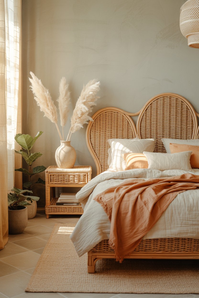 Rattan furniture introduces organic curves and natural texture that soften the hard angles typically found in bedroom architecture. The woven construction creates dimensional shadows that shift with natural light throughout the day, providing subtle visual stimulation without distraction. Consider a rattan bed frame, nightstand, or accent chair to establish what I call “textural rhythm”—the repetition of natural patterns that our eyes find inherently soothing. Rattan’s lightweight appearance prevents the space from feeling heavy despite its substantial presence, making it ideal for earthy bedroom ideas in smaller spaces seeking organic warmth.