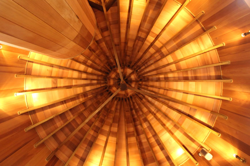 The ceilings of each turret have exposed beams and intersecting angles. From the inside, this creates space. From the outside, it gives the building its conical shape.