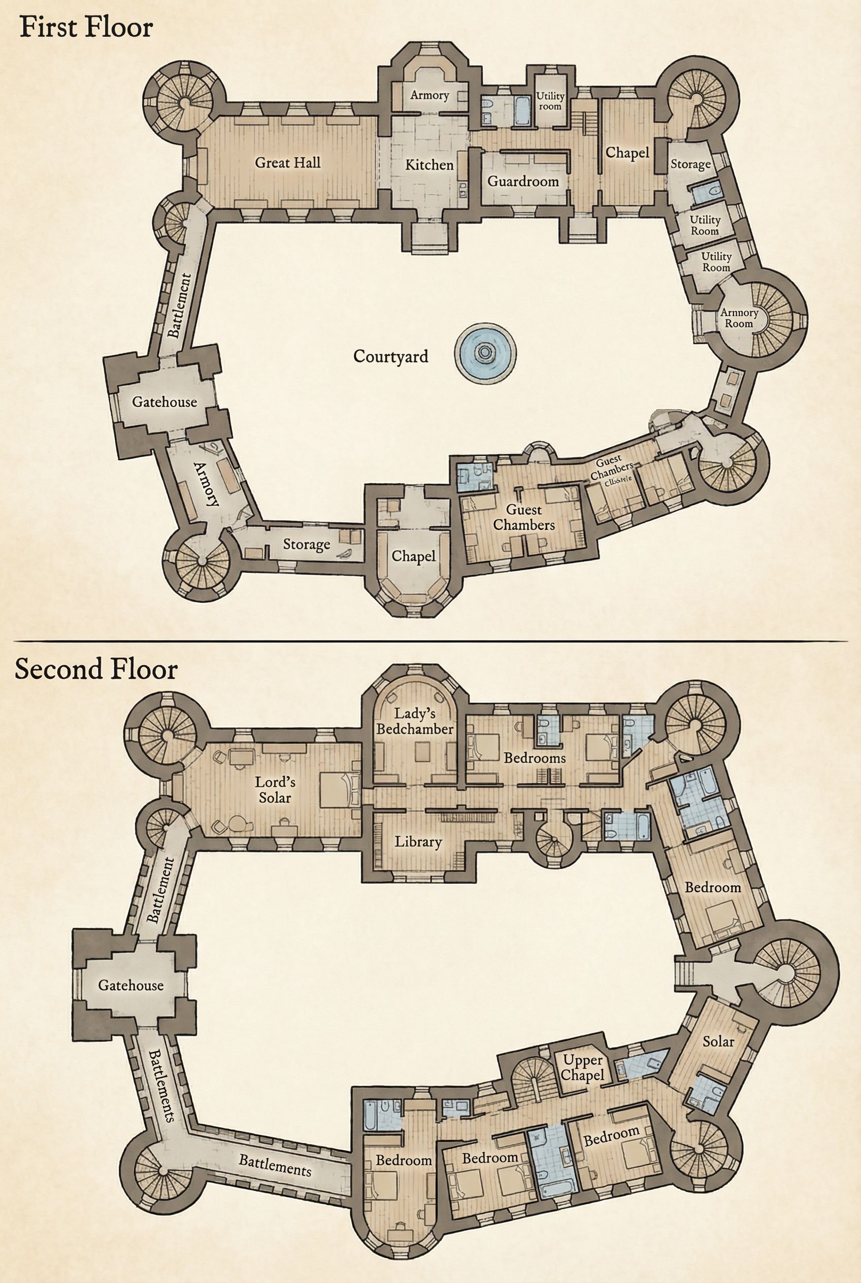 This medieval-inspired floor plan shows a sprawling fortress built around a central open courtyard with a fountain. The first floor includes functional spaces like the great hall, kitchen, chapel, guest chambers, and guardrooms, all arranged within thick stone walls and defensive towers. The second floor contains private quarters including the lord’s solar, the lady’s bedchamber, multiple bedrooms, and a grand library, emphasizing luxury and hierarchy within the castle.