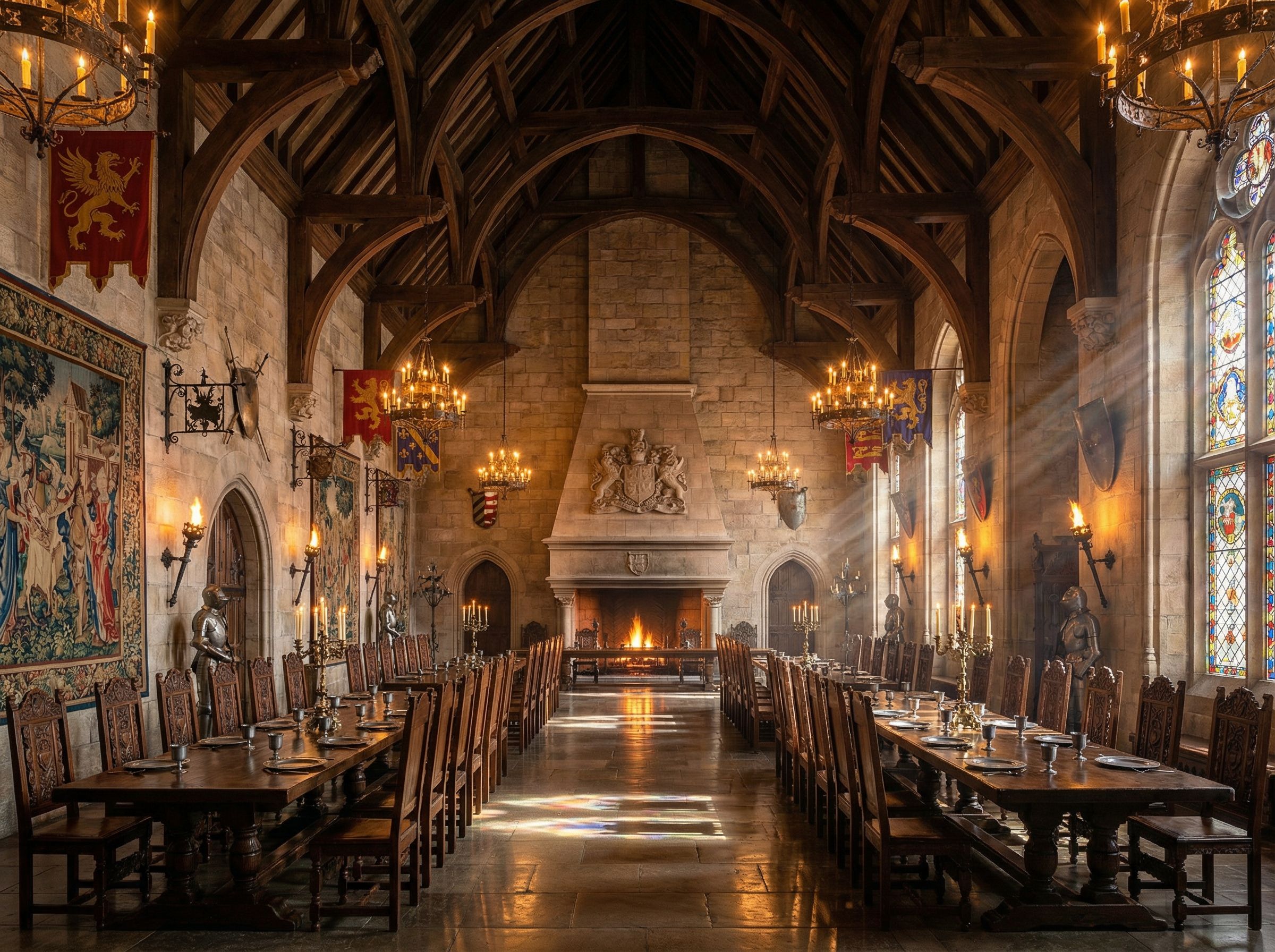 This magnificent great hall features soaring timber beams, stone walls draped with medieval tapestries, and long banquet tables arranged for feasts. Sunlight streams through stained glass windows, catching the polished floors and filling the massive space with warm, golden light. Two roaring fireplaces anchor the room, creating a dramatic atmosphere suited for gatherings, ceremonies, and royal hospitality.