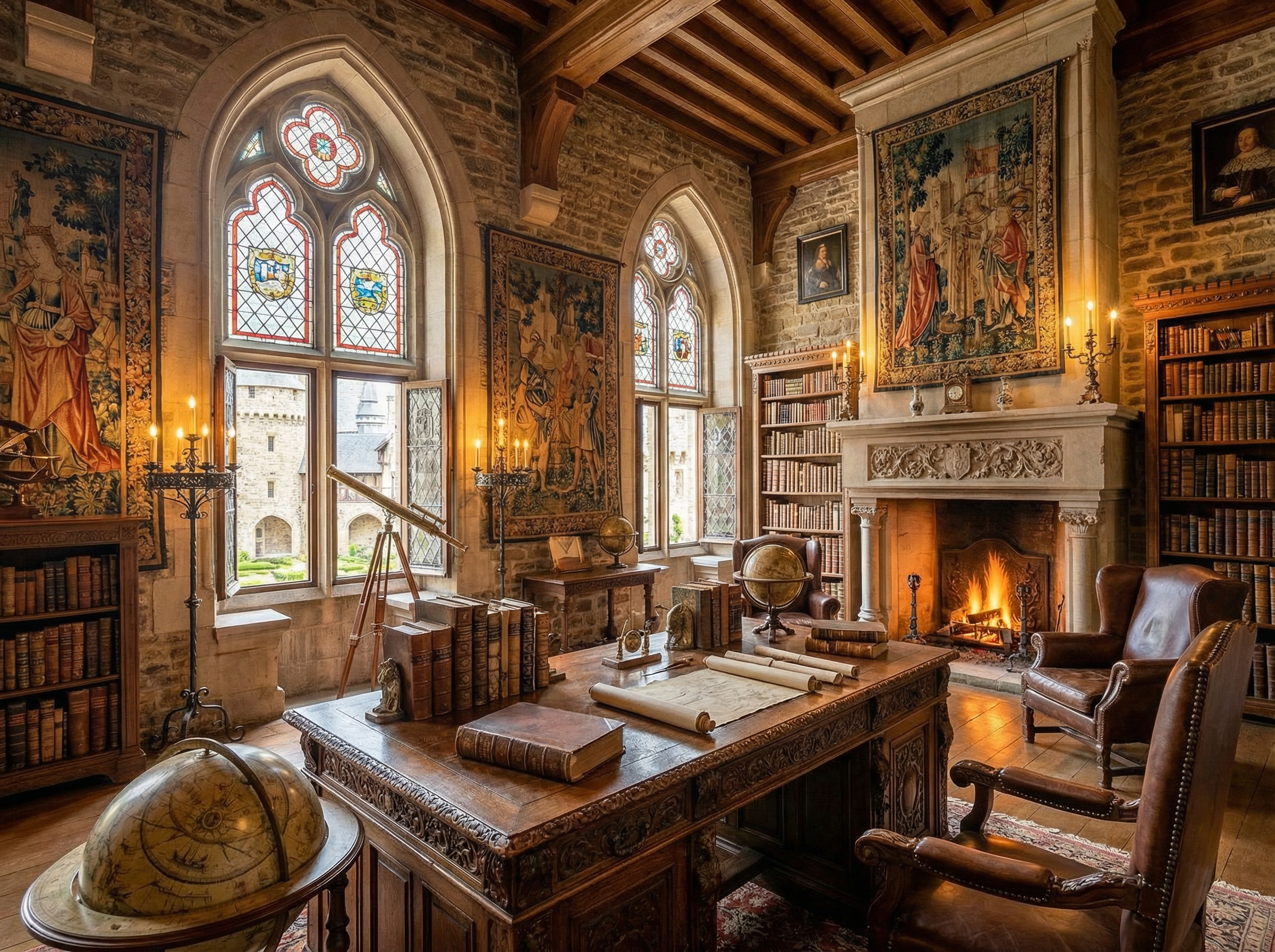 The study exudes intellectual grandeur with floor-to-ceiling bookshelves, carved wooden furniture, and richly detailed tapestries. Leaded-glass windows overlook the castle grounds, filling the room with soft natural light that complements the glow of candles and the crackling fireplace. Globes, scrolls, and scientific instruments give the space the feel of a scholar’s retreat, blending luxury with medieval curiosity.
