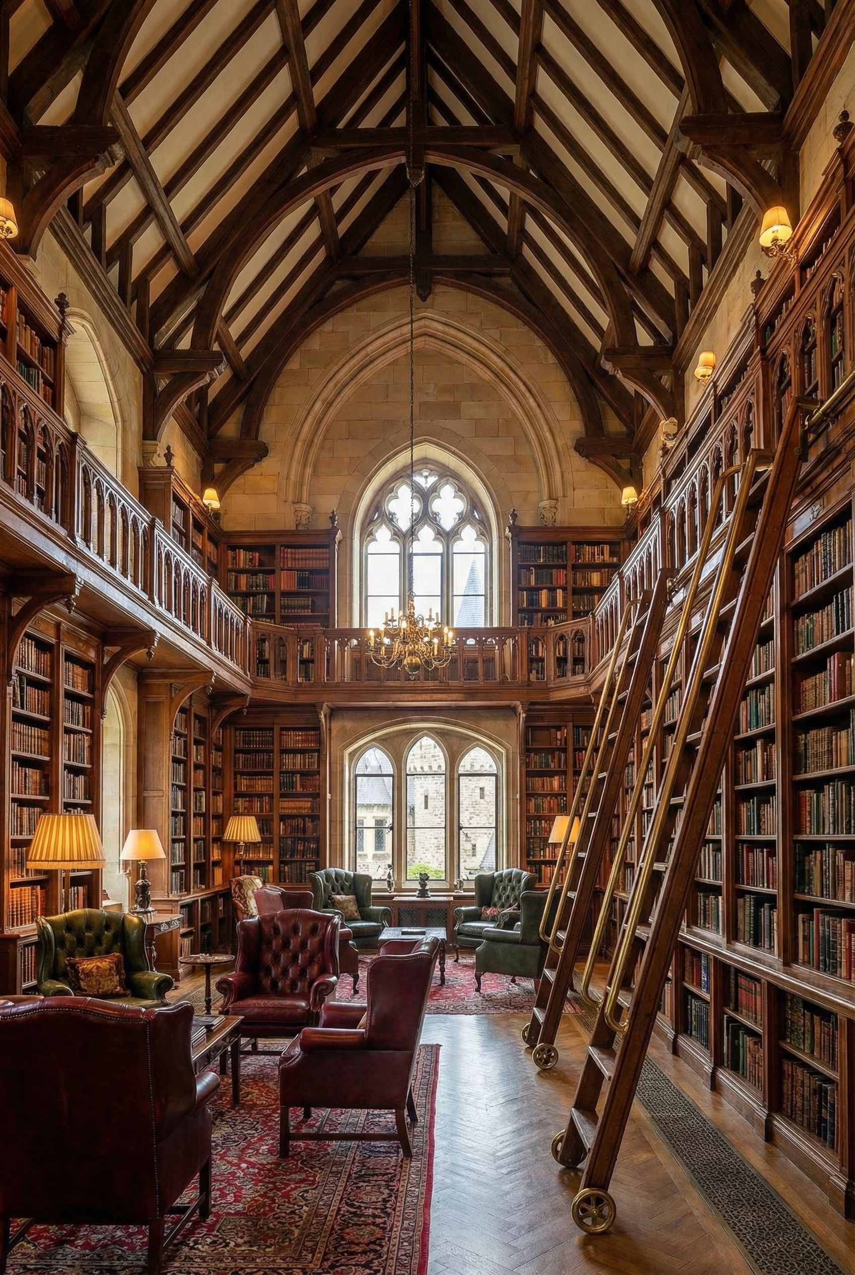 The castle library is a towering two-story chamber lined with wooden balconies, rolling ladders, and endless shelves of leather-bound books. Tall arched windows illuminate the warm woodwork and richly patterned rugs below. Armchairs and reading nooks create an atmosphere of intellectual luxury, evoking centuries of history and scholarship.