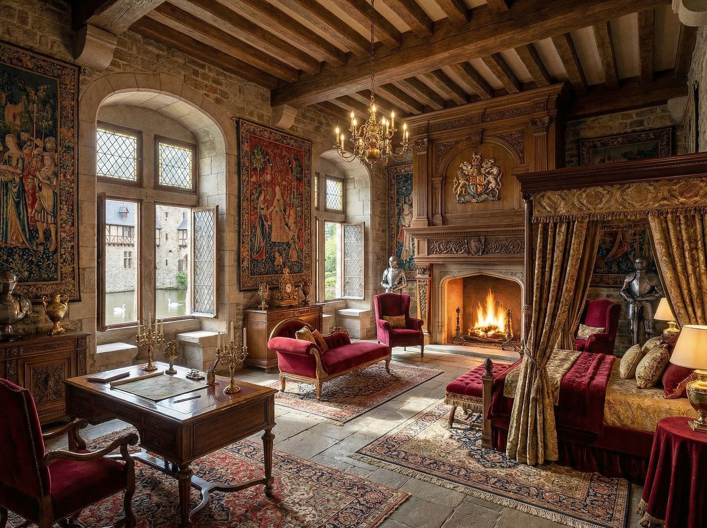 This sumptuous chamber features a grand fireplace carved with heraldic detail, opulent tapestries, and stone mullioned windows overlooking the moat. Plush seating, ornate furniture, and rich fabrics in deep reds and golds create an intimate yet majestic retreat. The room blends comfort with regal authority, serving as a private sanctuary for the lord of the castle.