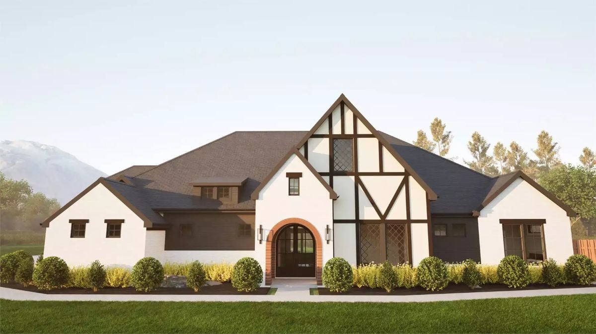 This European-inspired home features clean white exterior finishes, bold dark accents, and striking half-timber detailing for a distinctive modern look. The arched front entry adds character while keeping the design polished and welcoming.