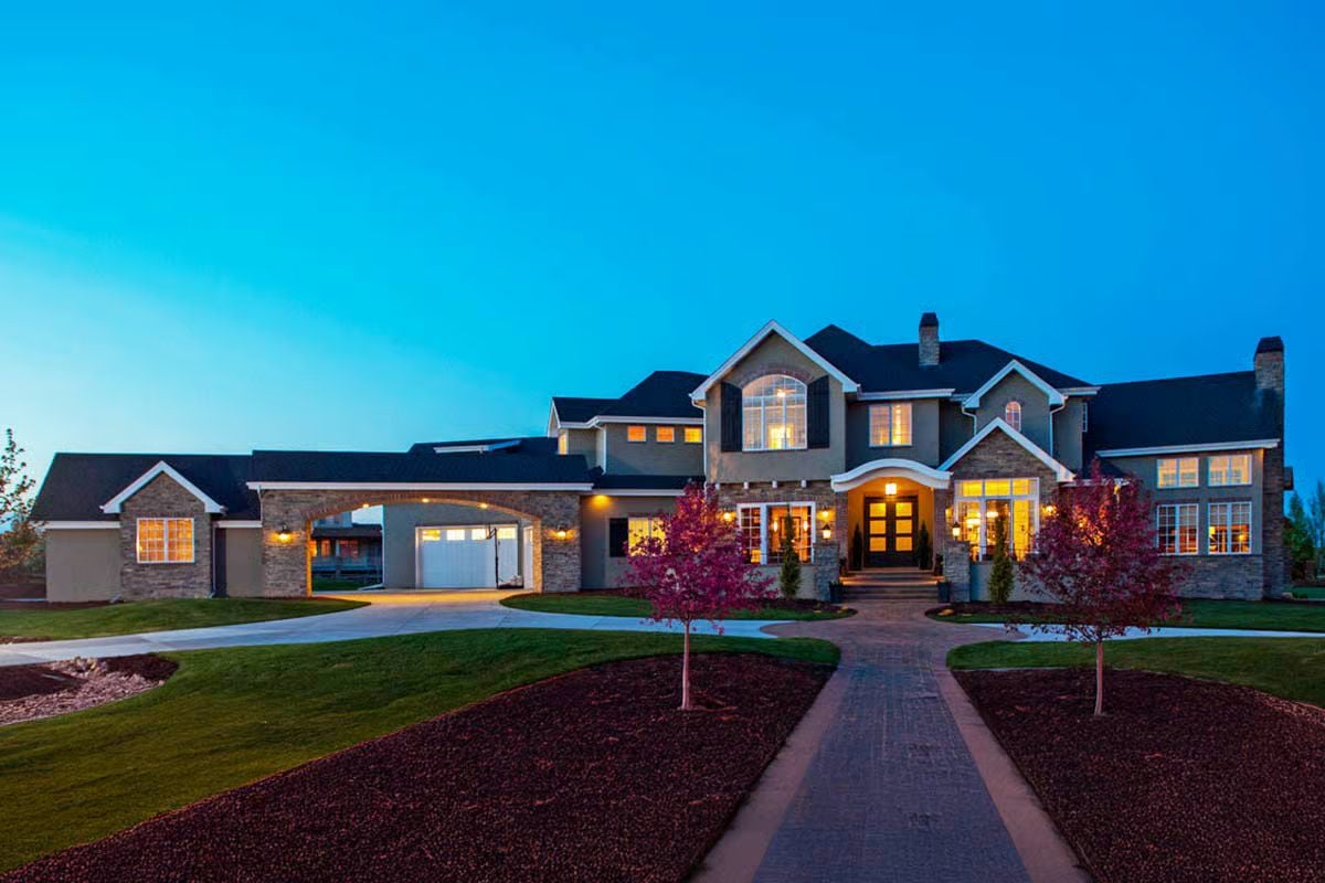 This European-inspired home presents a refined, estate-style exterior with a balanced mix of stone and smooth stucco finishes. Multiple rooflines, arched details, and warm exterior lighting give the faรงade a grand yet inviting presence. A central entry is framed by symmetrical wings, while courtyards and covered patios extend the homeโs livability outdoors and enhance its sense of scale.