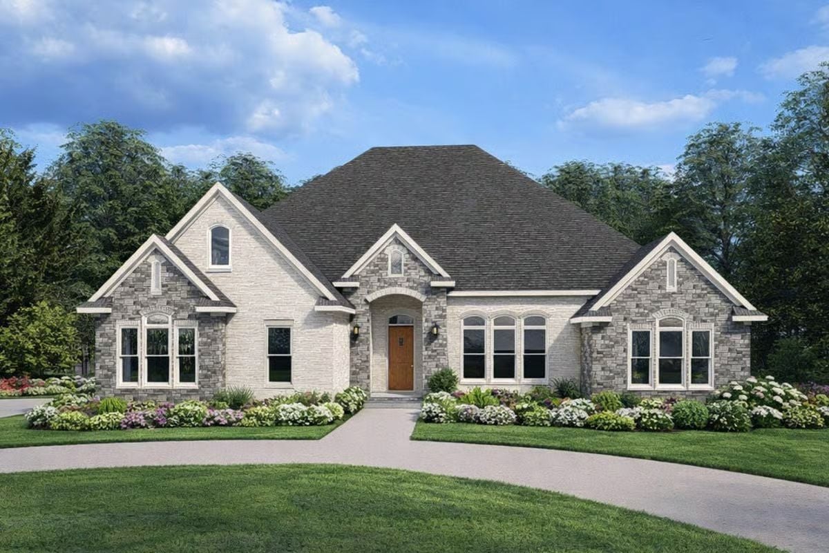 This European New American home showcases a polished stone-and-brick exterior with steep rooflines, detailed gables, and a welcoming arched entry. Large front-facing windows bring in plenty of natural light while adding classic curb appeal.