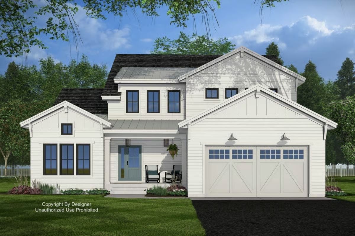 This modern farmhouse design blends classic curb appeal with clean, updated detailing, featuring bright siding, simple gabled forms, and a welcoming covered front porch. The attached two-car garage keeps the exterior balanced and functional, while the overall look stays crisp and timeless.