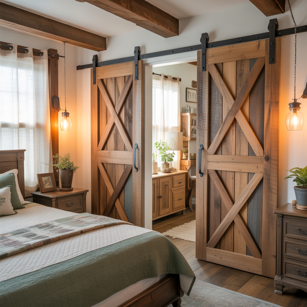 Barn doors serve both functional and aesthetic purposes, saving space while introducing authentic agricultural heritage into bedroom design. The sliding hardware becomes sculpture in motion, with metal tracks and wheels adding industrial contrast to softer bedroom elements.