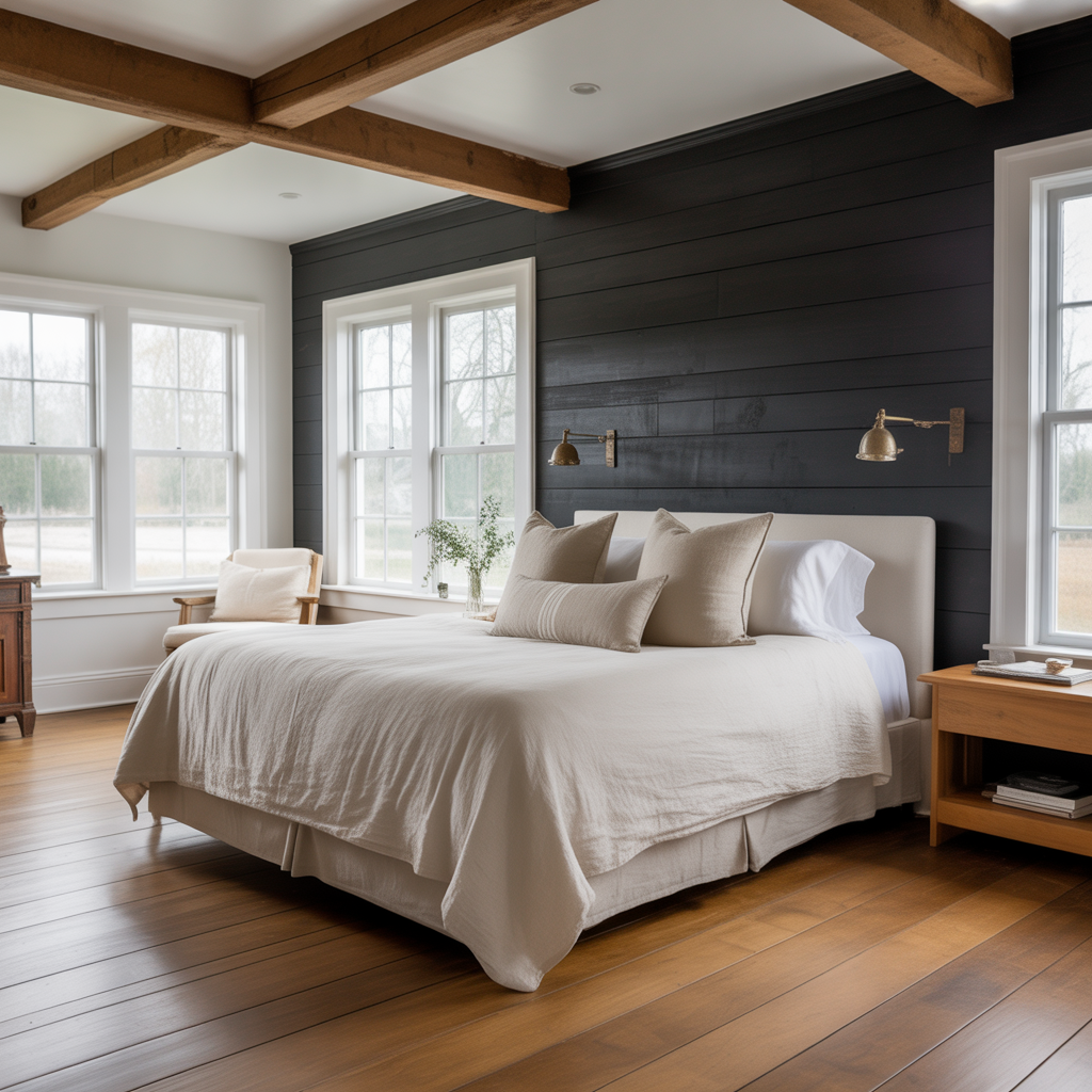 Black accent walls in farmhouse bedrooms represent a bold departure from traditional lighter palettes, introducing drama while maintaining rustic charm. This unexpected choice creates depth and intimacy, particularly effective in larger bedrooms that might otherwise feel cavernous.