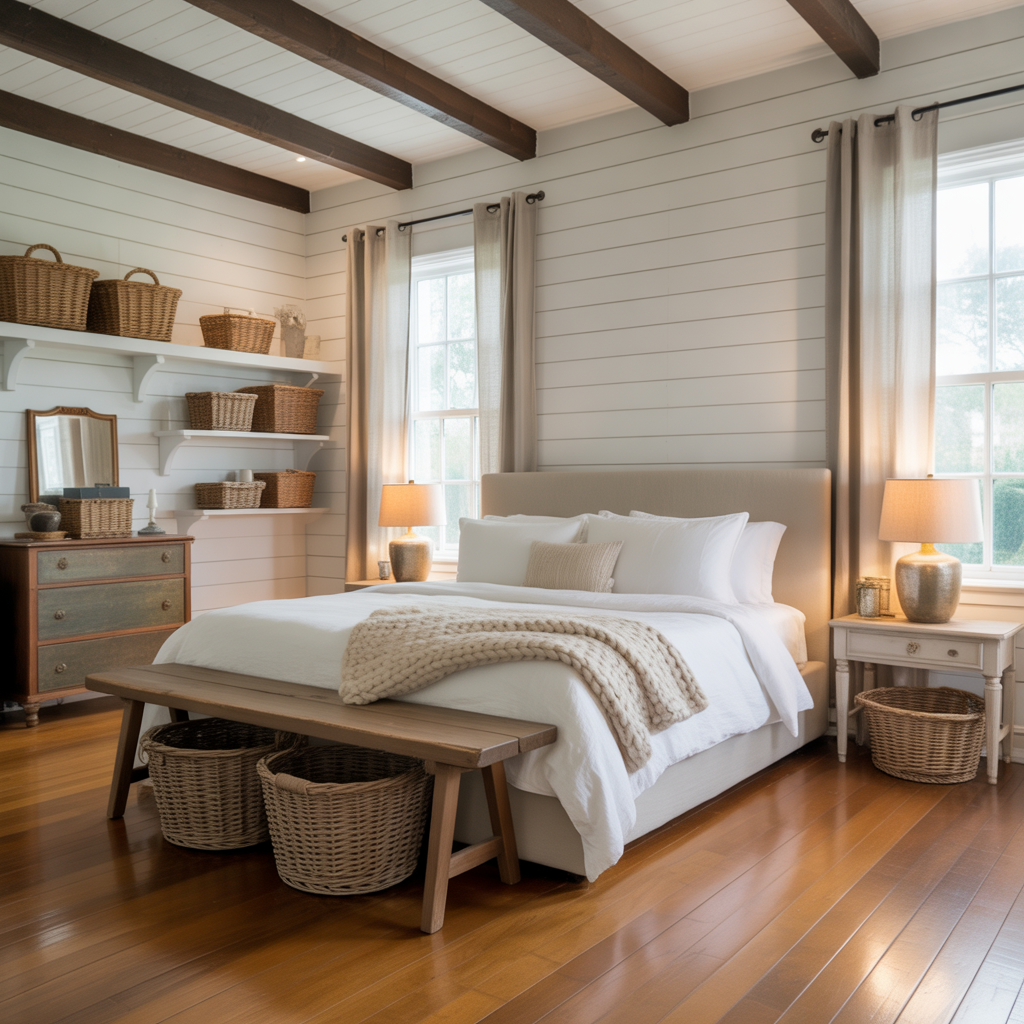 Woven baskets solve storage challenges while adding organic texture that softens farmhouse bedrooms aesthetically. These practical accessories hide clutter while remaining visible, their natural materials complementing wood furniture and neutral palettes seamlessly. Baskets introduce handcrafted elements that contrast with mass-produced items, satisfying our attraction to artisanal goods.