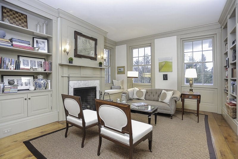 The light gray ceiling and light gray patterned area rug matches with the light gray wooden finish of the walls that have built-in cabinets on one side, a fireplace in the middle with a wall-mounted mirror on top and a charming reading nook at the corner by the windows.