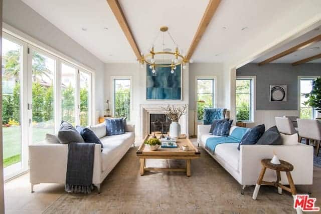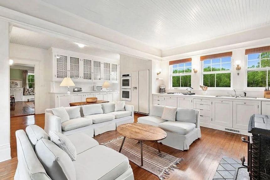 This is a bright Farmhouse-style living room with a white wooden ceiling that has white exposed wooden beams matching with the white walls that bring in an abundance of natural lighting through the surrounding tall windows that lighten up the gray comfortable sofas.