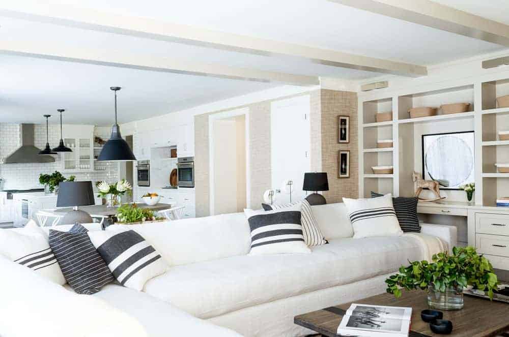 The farmhouse living room aesthetic works great when thereโs a large source of natural light that flows in during the day to bring pleasantness to the far corners of the room. When the sun goes down, the farmhouse living room relies on table lamps to provide small sources of gentle light that cast a lot of shadows.