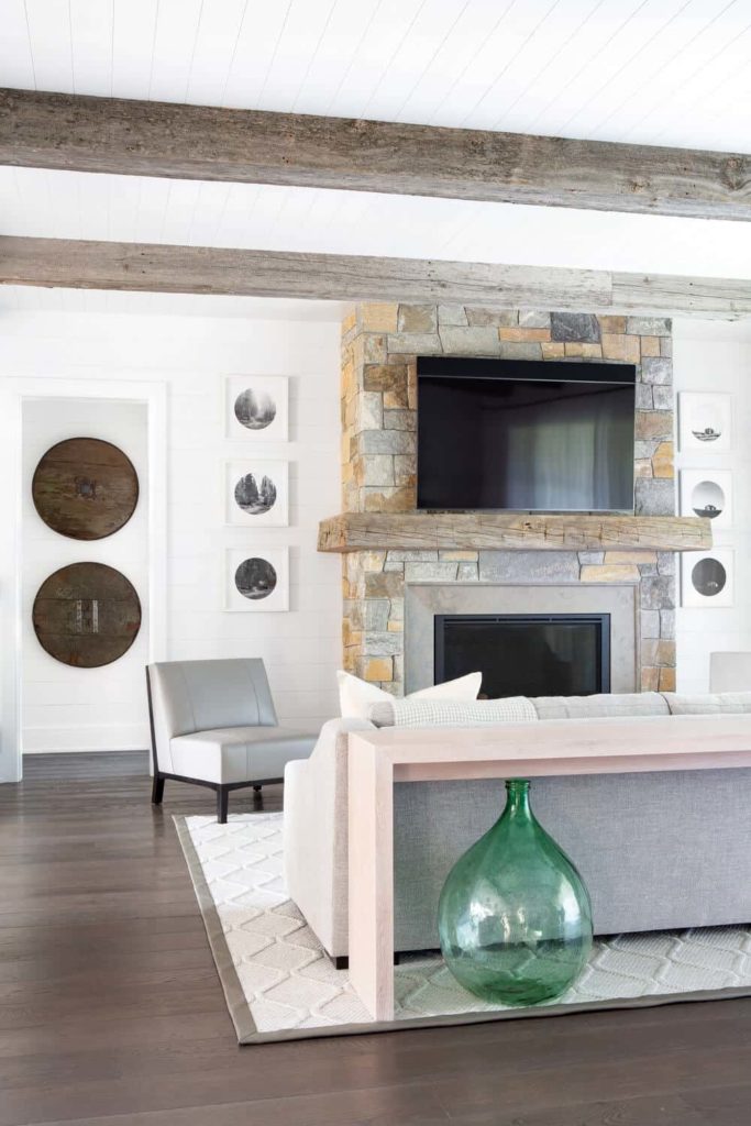 This simple yet gorgeous living room is dominated by the large stone structure that houses the fireplace and the wall-mounted TV above it. This reaches to the cathedral ceiling with exposed beams and hangs a decorative chandelier over the wooden coffee table of the L-shaped sectional leather sofa.
