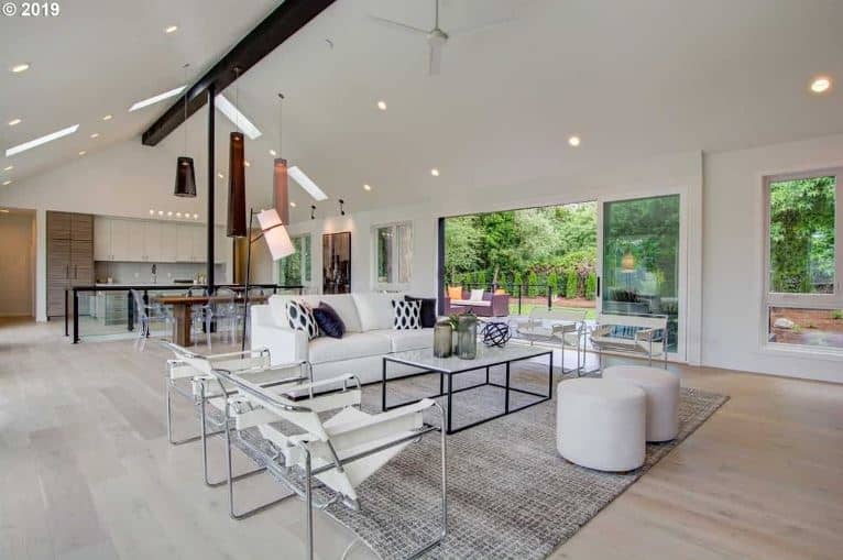 The white cathedral ceiling has a single contrasting exposed wooden beam right in the middle that supports the white ceiling fan. This matches the white sofa, white modern armchairs, and the two white round ottomans that stand out against the gray area rug.