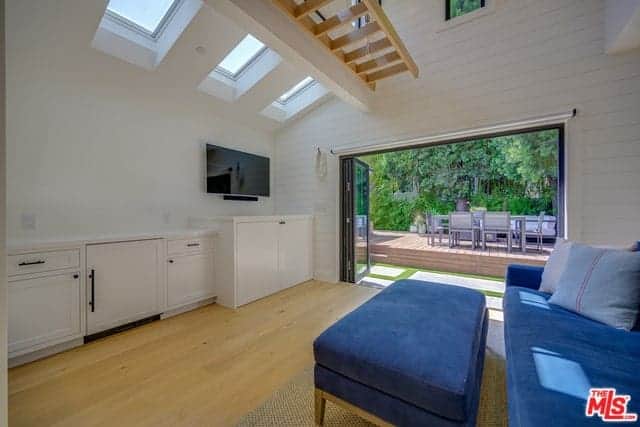 This Farmhouse-style living room is brightened by the large wall that opens up due to the folding glass doors. This brings in an abundance of natural lighting and a wonderful view for those who are lounging on the comfortable white sectional sofa warmed by the white fireplace.