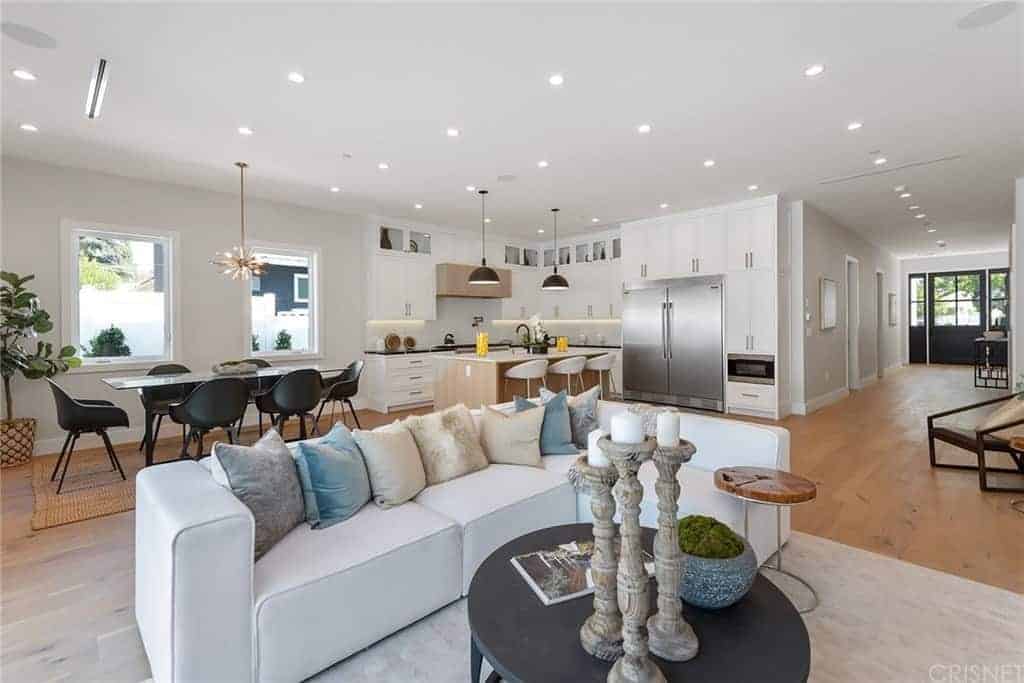 This is a cozy living room that is apparently inside the kitchen. It sits in the middle of the hardwood flooring that is surrounded by kitchen peninsulas with white shaker cabinets and drawers. This matches with the light gray cushioned sofa set surrounding a small elliptical wooden coffee table.