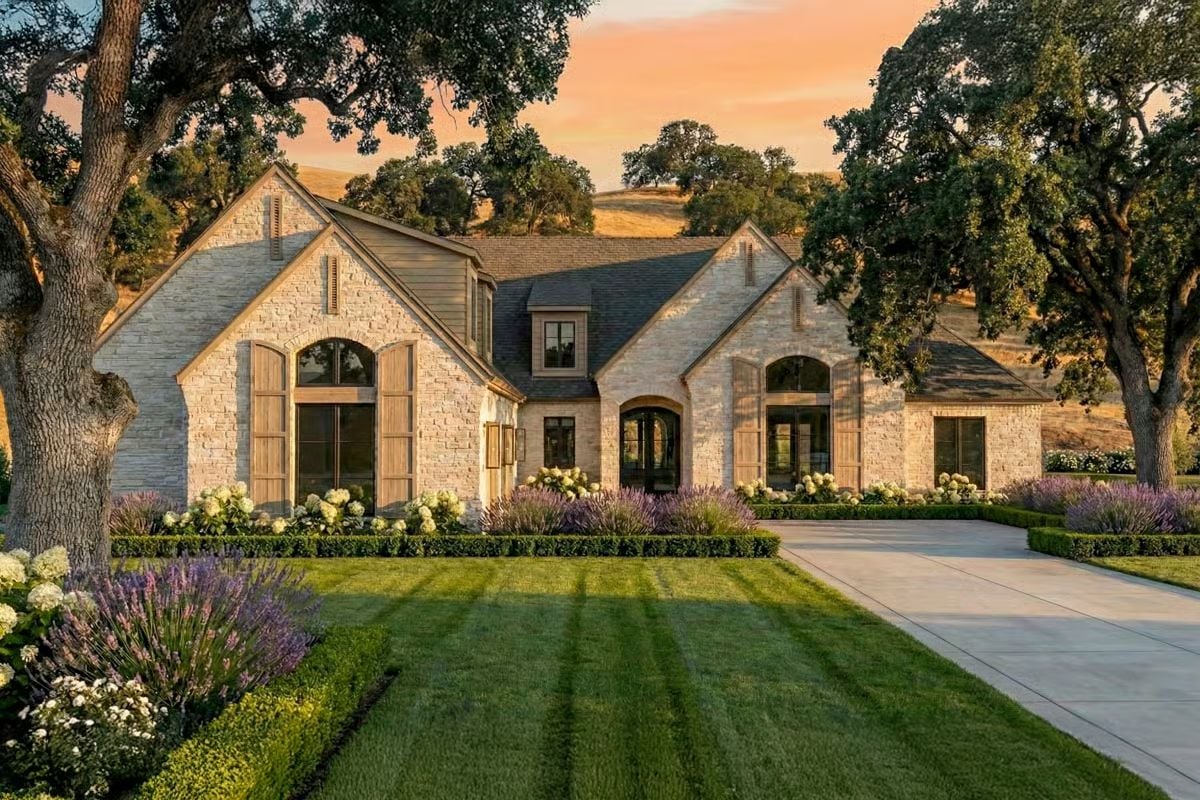This French country home features a refined stone exterior, steep gabled rooflines, and tall arched windows that give the façade a composed, classic presence. Wood accents and a recessed entry add warmth while keeping the overall design clean and structured.