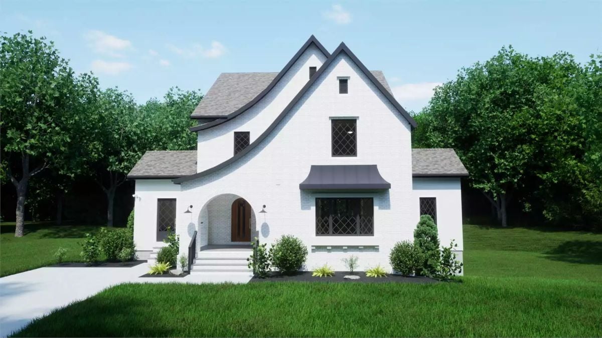 This French country home features a sculpted roofline, smooth masonry exterior, and an arched front entry that gives the façade a distinct, traditional presence. Dark window accents and subtle metal details add contrast while keeping the overall look clean and composed.