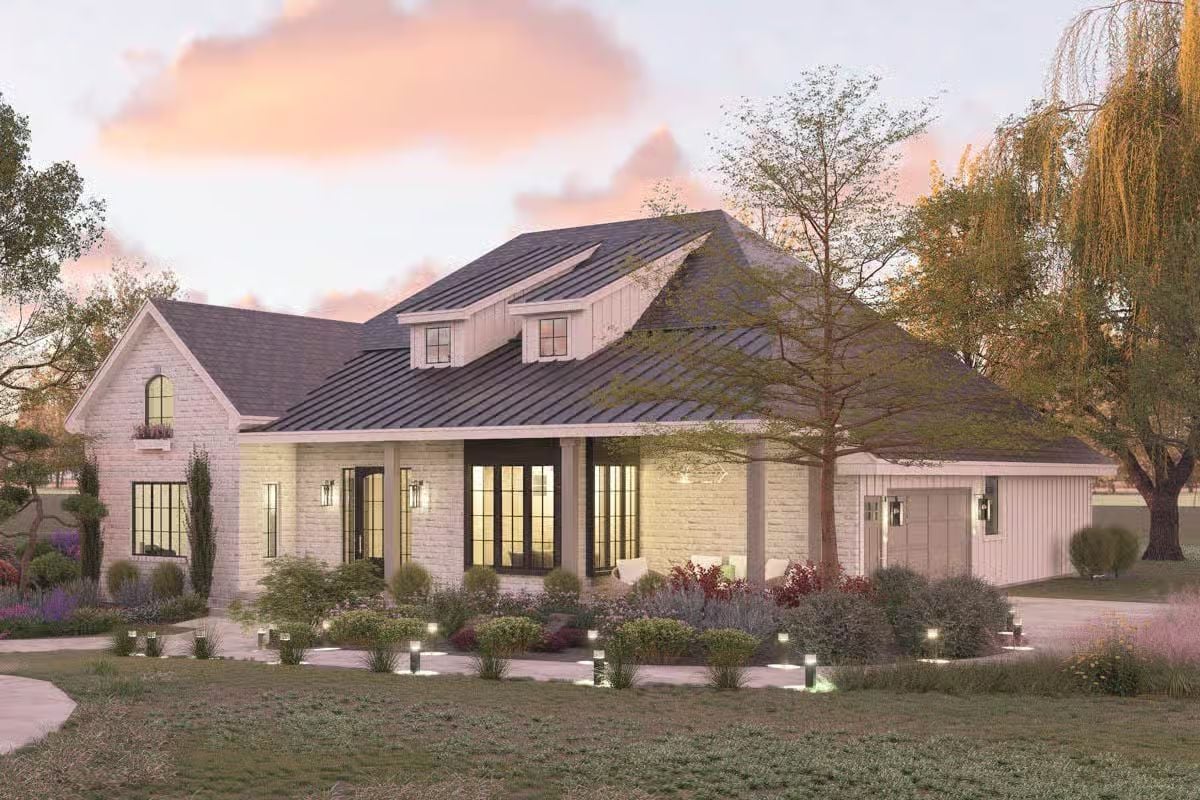 This French countryโinspired home combines a low, welcoming roofline with stone accents, soft siding tones, and deep covered porches that wrap the front and side of the house. The exterior feels substantial and grounded, with balanced proportions and simple detailing that keeps the look refined rather than ornate.