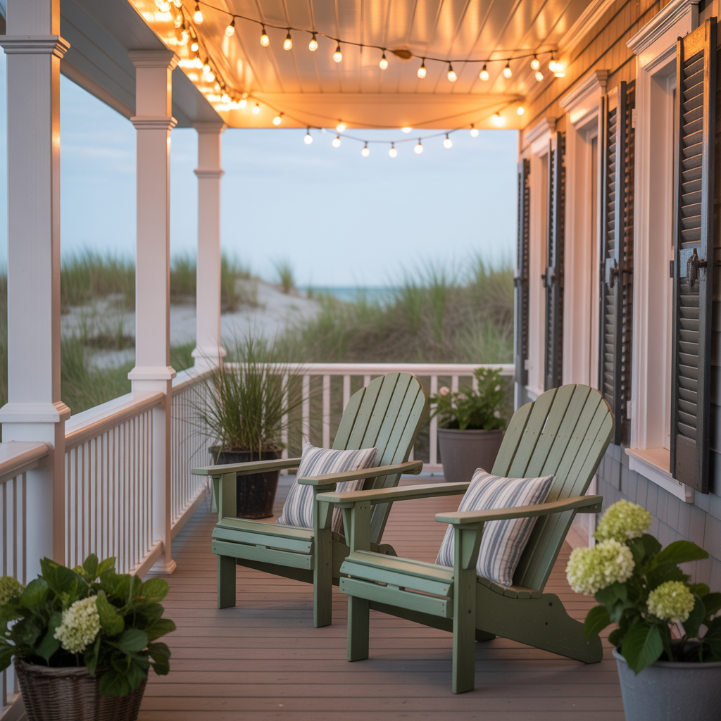 Coastal Front Porch String Lights with Adirondack Chair Seating