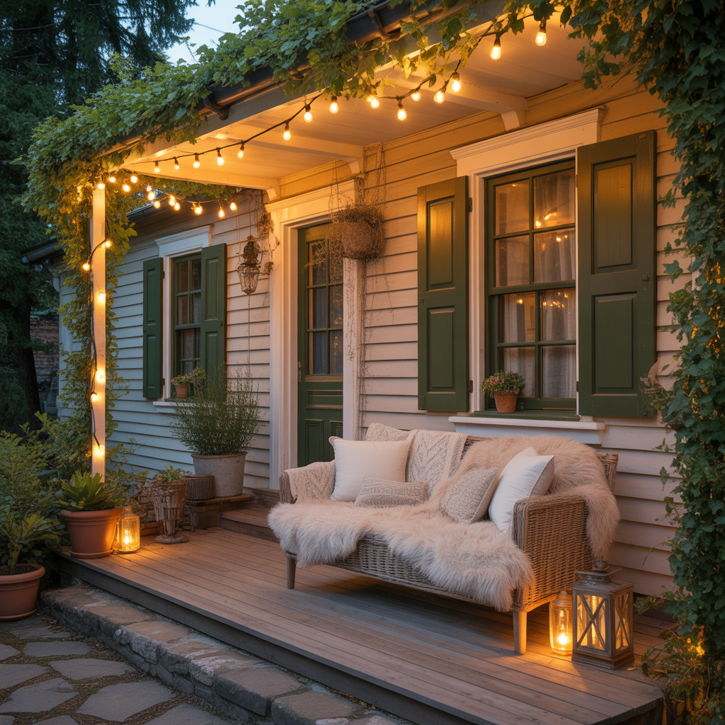A cushioned loveseat creates intimate, romantic seating perfect for cottage-style porches. String lights draped in gentle scallops overhead enhance the storybook charm while providing practical illumination. This pairing embodies โcottage intimacyโโscaled-down proportions that feel personally curated rather than generically decorated. Choose floral or ticking stripe cushions, add a small side table for morning coffee, and let string lights create a glowing canopy that extends summer evenings and makes even small porches feel genuinely magical.