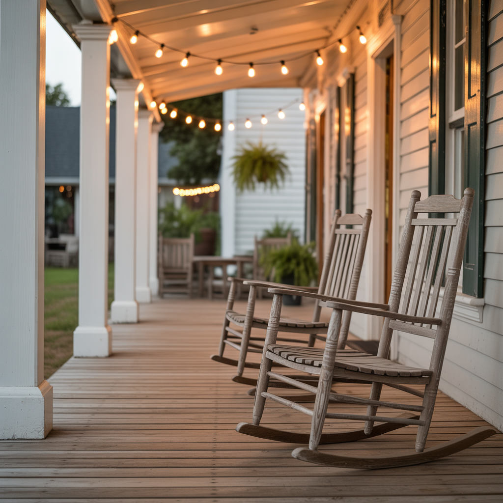 Farmhouse Front Porch with Edison String Lights and Rocking Chairs