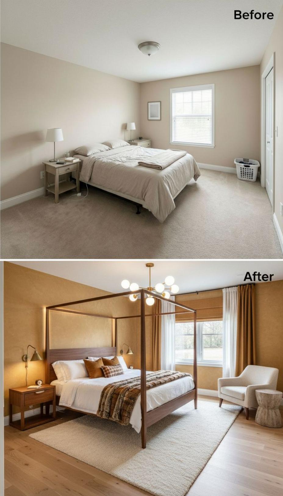 Warm honey-toned walls replaced bland beige paint while a striking walnut four-poster bed became the room’s commanding focal point. Modern brass lighting fixtures illuminate layered textiles including rich throw blankets and accent pillows. Natural wood flooring, a neutral area rug, and thoughtfully positioned seating created a sophisticated guest retreat that feels both luxurious and welcoming for overnight visitors.