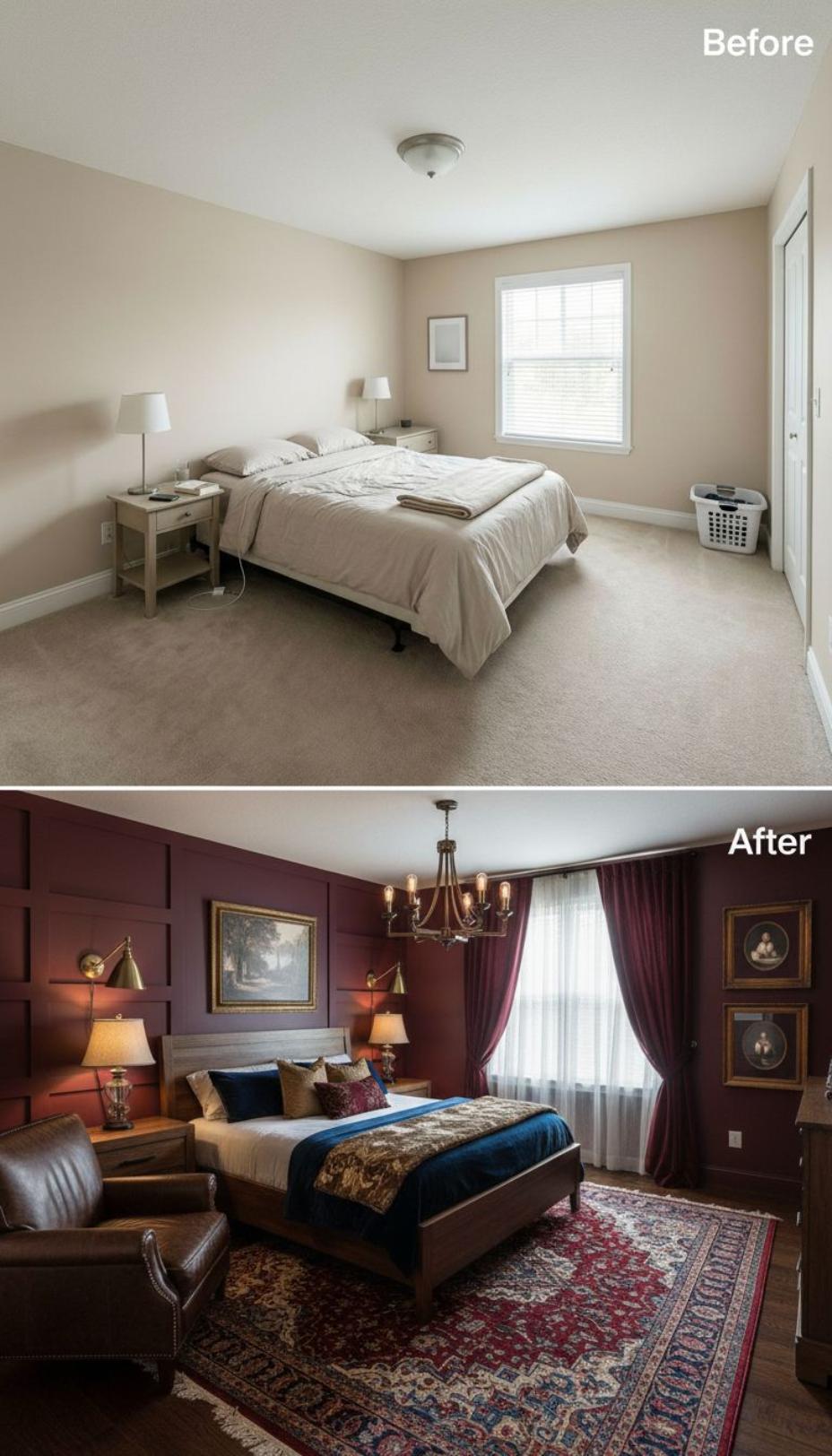 Deep burgundy walls with wainscoting replace neutral beige paint, creating dramatic elegance in this transformed space. Rich brass swing-arm sconces and an ornate chandelier elevate the basic ceiling fixture, while luxurious burgundy velvet curtains frame the window with theatrical flair. Traditional oil paintings, a Persian area rug, and leather accent chair complete the sophisticated makeover that turns a generic builder grade guest bedroom into a refined retreat worthy of any discerning visitor.