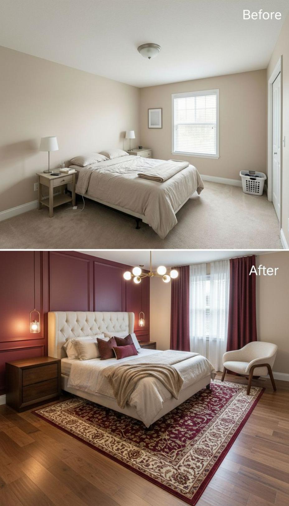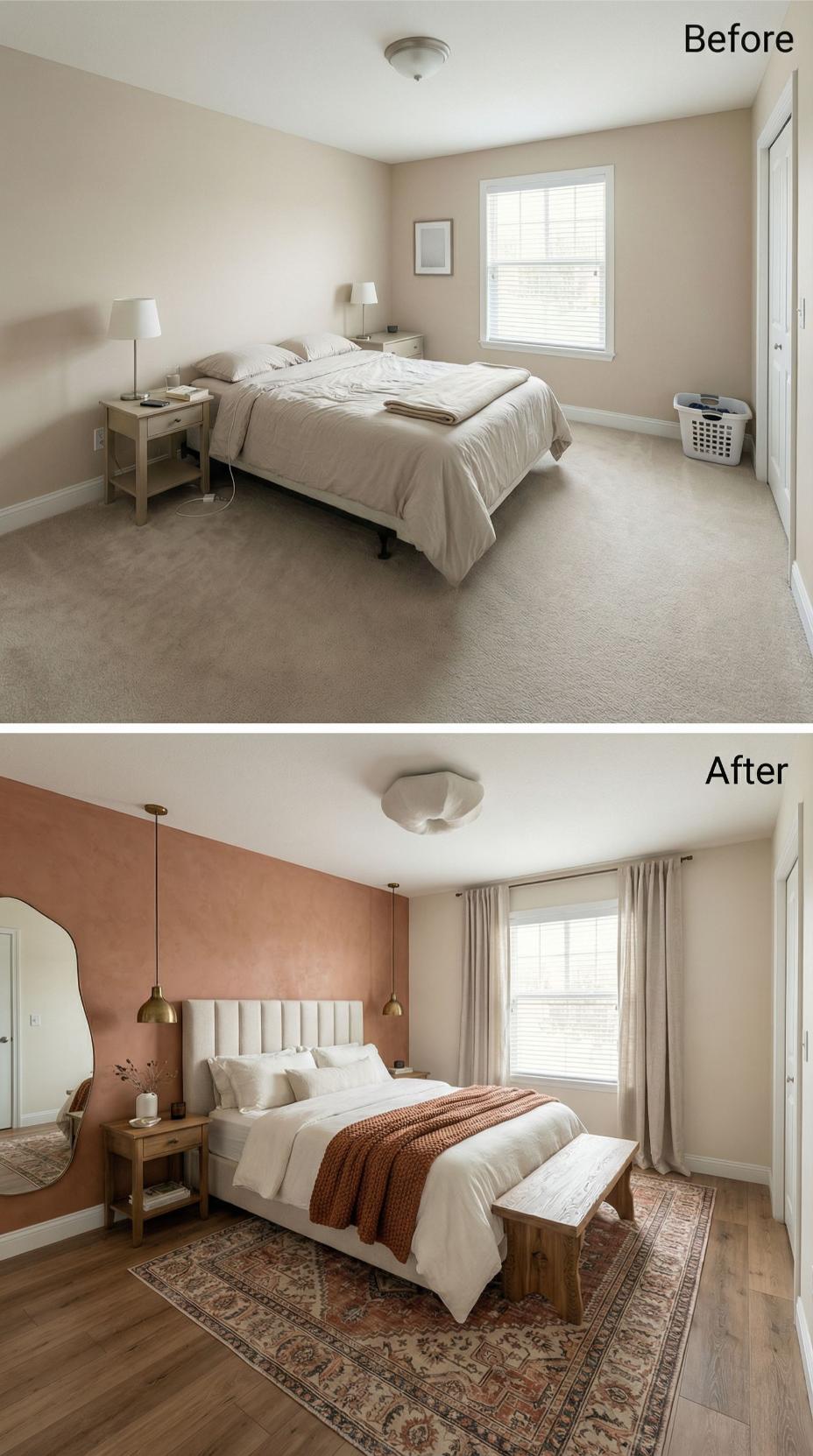 Dramatic transformation elevates this builder grade guest bedroom into a sophisticated retreat through rich terracotta accent walls and luxurious textures. White channel-tufted headboard creates striking contrast against the warm backdrop, while brass pendant lights replace basic table lamps for elevated ambiance. Persian-style area rug and natural wood flooring replace bland carpet, instantly adding character and warmth to welcome overnight guests.
