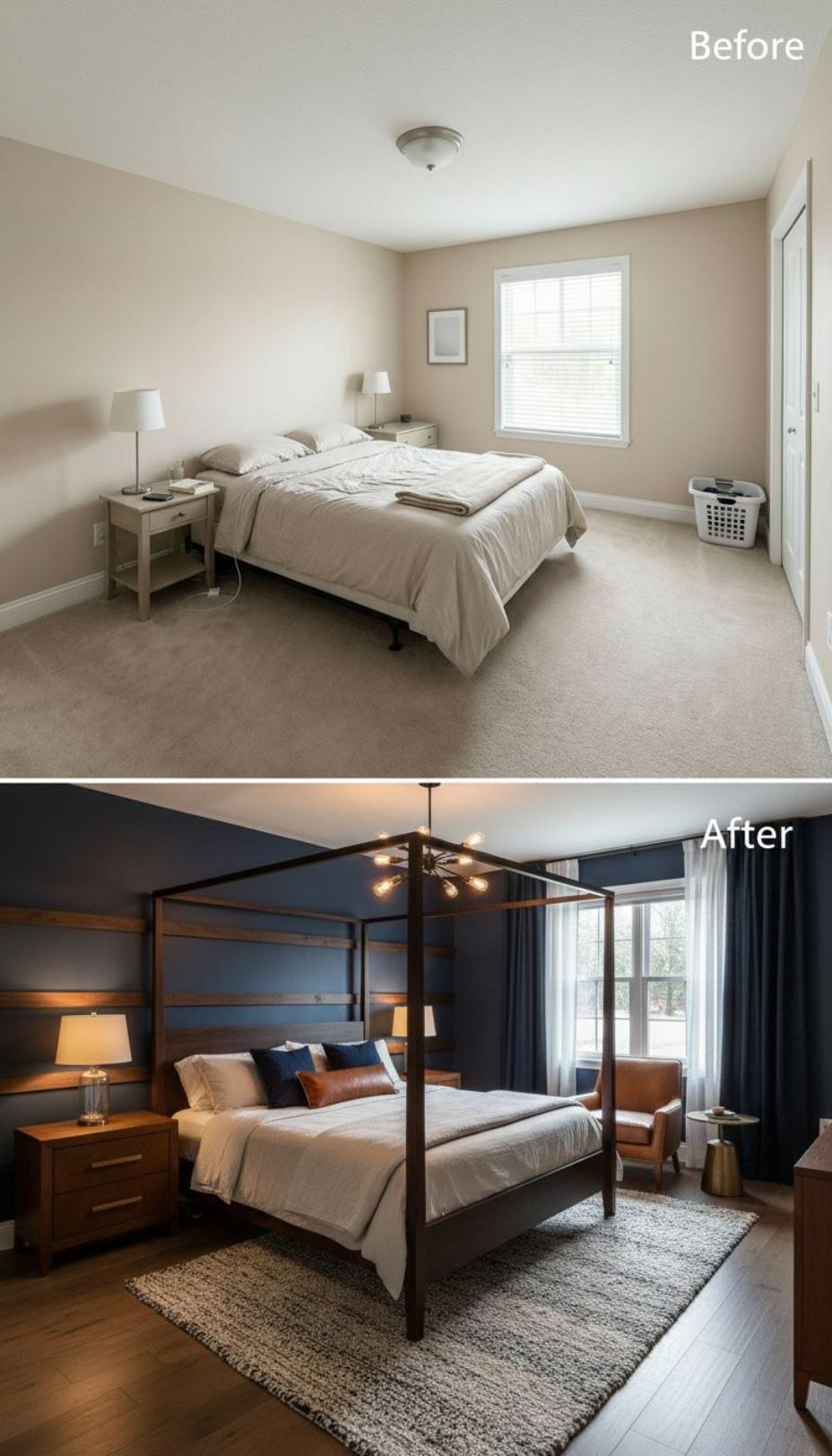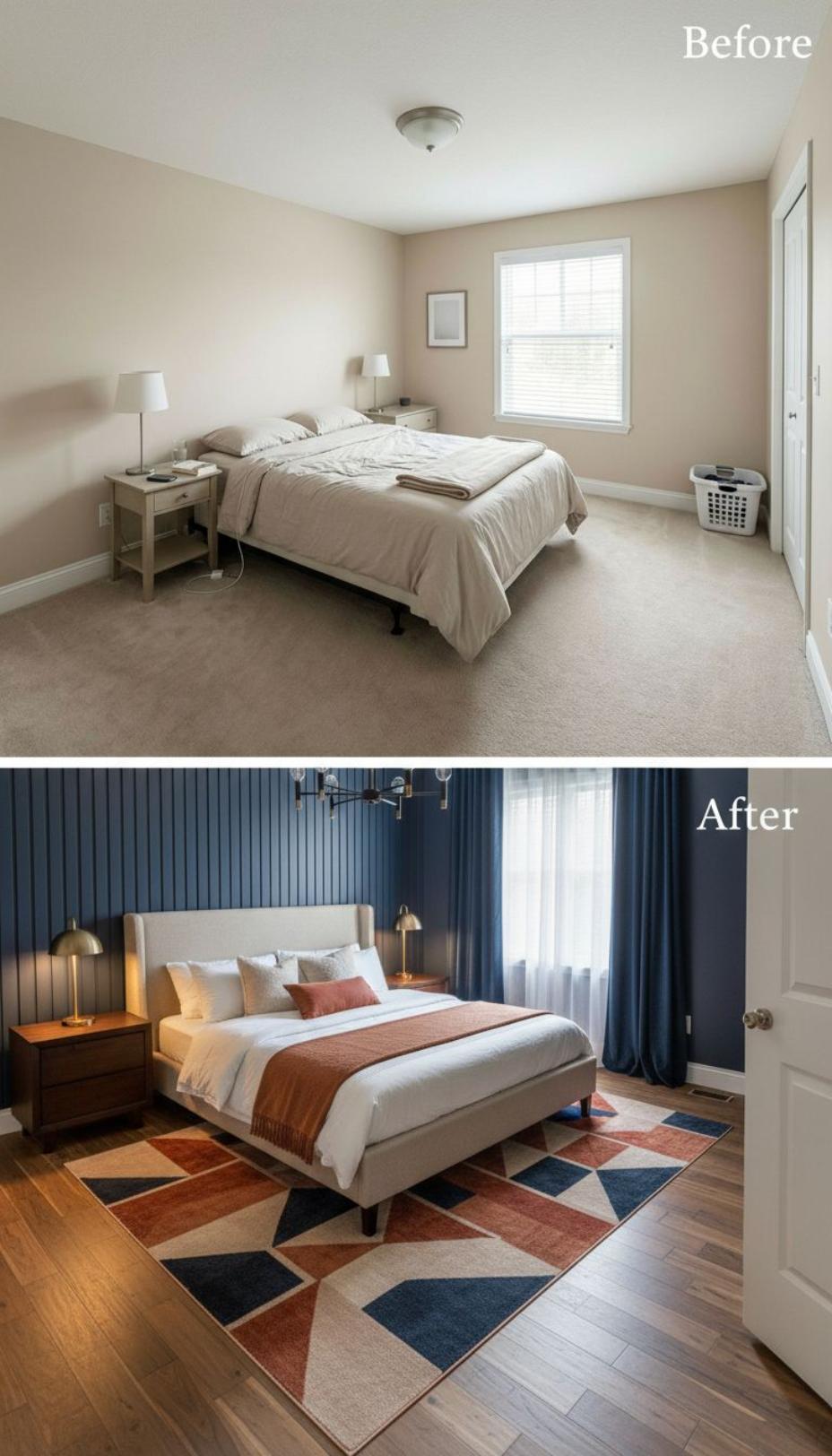 Dramatic navy vertical paneling transforms bland beige walls into a striking focal point behind the sleek upholstered platform bed. Rich hardwood flooring replaces basic carpet while geometric area rugs in rust and navy tones anchor the space. Warm brass task lighting and layered window treatments with matching curtains elevate this once-generic room into a sophisticated retreat.