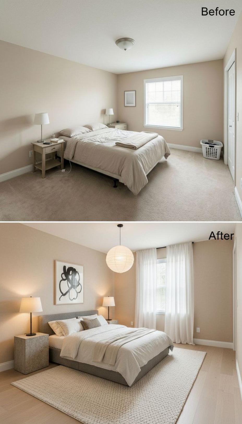 Dramatic transformation elevates this builder grade guest bedroom through strategic design upgrades that maximize visual impact. The previous bland beige space gains sophisticated character with a striking white paper globe pendant light, contemporary gray upholstered platform bed, and flowing white curtain panels that soften the window. Natural jute area rug grounds the neutral palette while abstract black artwork adds artistic flair above the headboard.