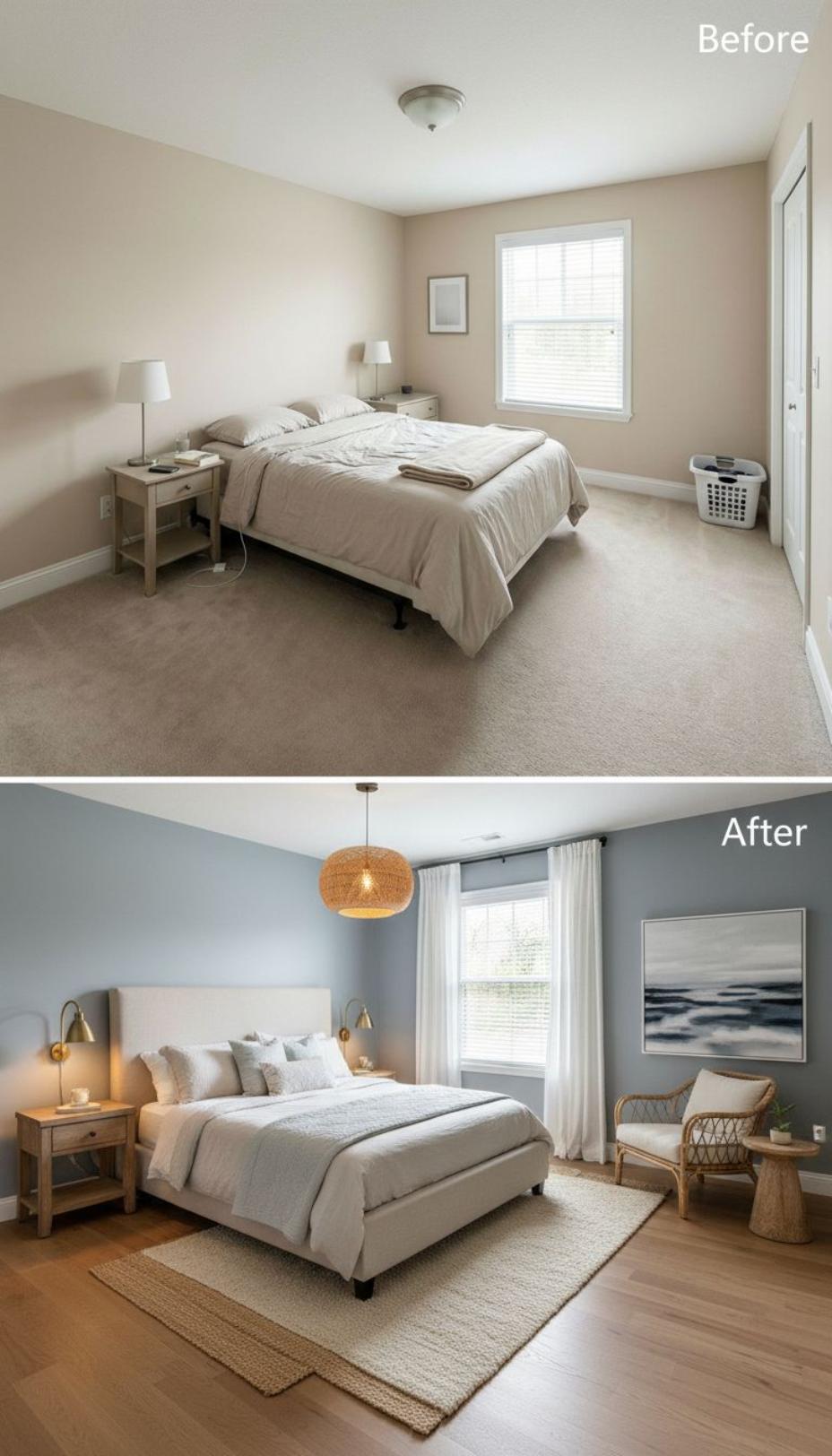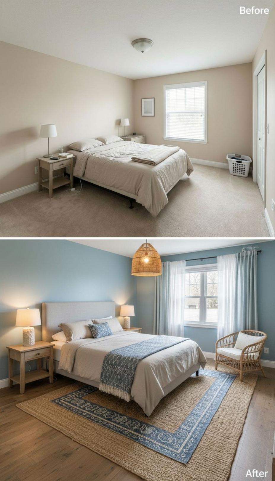 Soft blue walls replace beige builder-grade paint, instantly transforming this once-sterile guest bedroom into a welcoming coastal retreat. Natural textures like woven rattan and jute create warmth, while the upholstered headboard and layered bedding in cream and blue tones add sophisticated comfort. Statement lighting and curated accessories elevate the space from basic to boutique hotel chic.