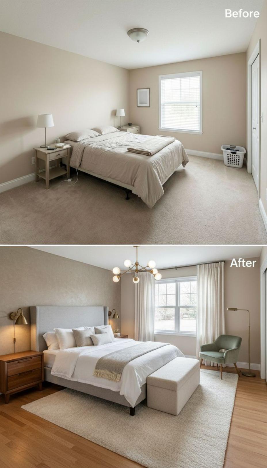 Warm walnut wood flooring replaces basic carpet, instantly elevating the builder grade guest bedroom’s foundation. A striking brass geometric chandelier commands attention overhead while sage green velvet seating and layered neutral textiles create inviting contrast. Wall-mounted brass sconces flanking an upholstered headboard eliminate nightstand clutter, and flowing white curtains soften the previously bare window, transforming this once-sterile space into a sophisticated retreat.