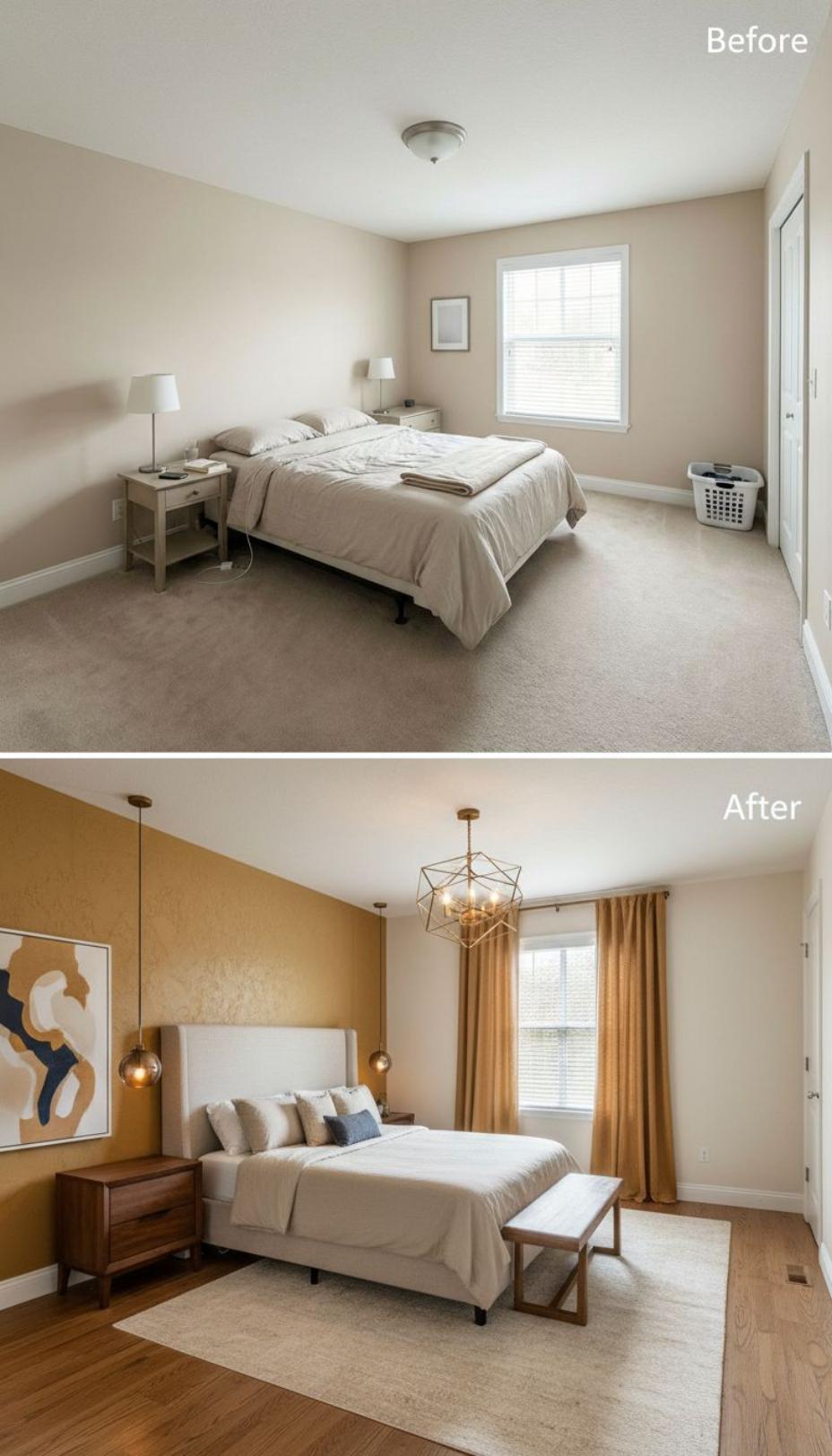Bold mustard yellow creates a stunning accent wall that transforms this builder grade guest bedroom into a sophisticated retreat. Geometric pendant lights and a statement chandelier replace basic overhead lighting, while rich walnut nightstands and a padded bench elevate the furniture selection. Golden curtains frame the window beautifully, complementing the warm color palette that makes guests feel welcomed and pampered.