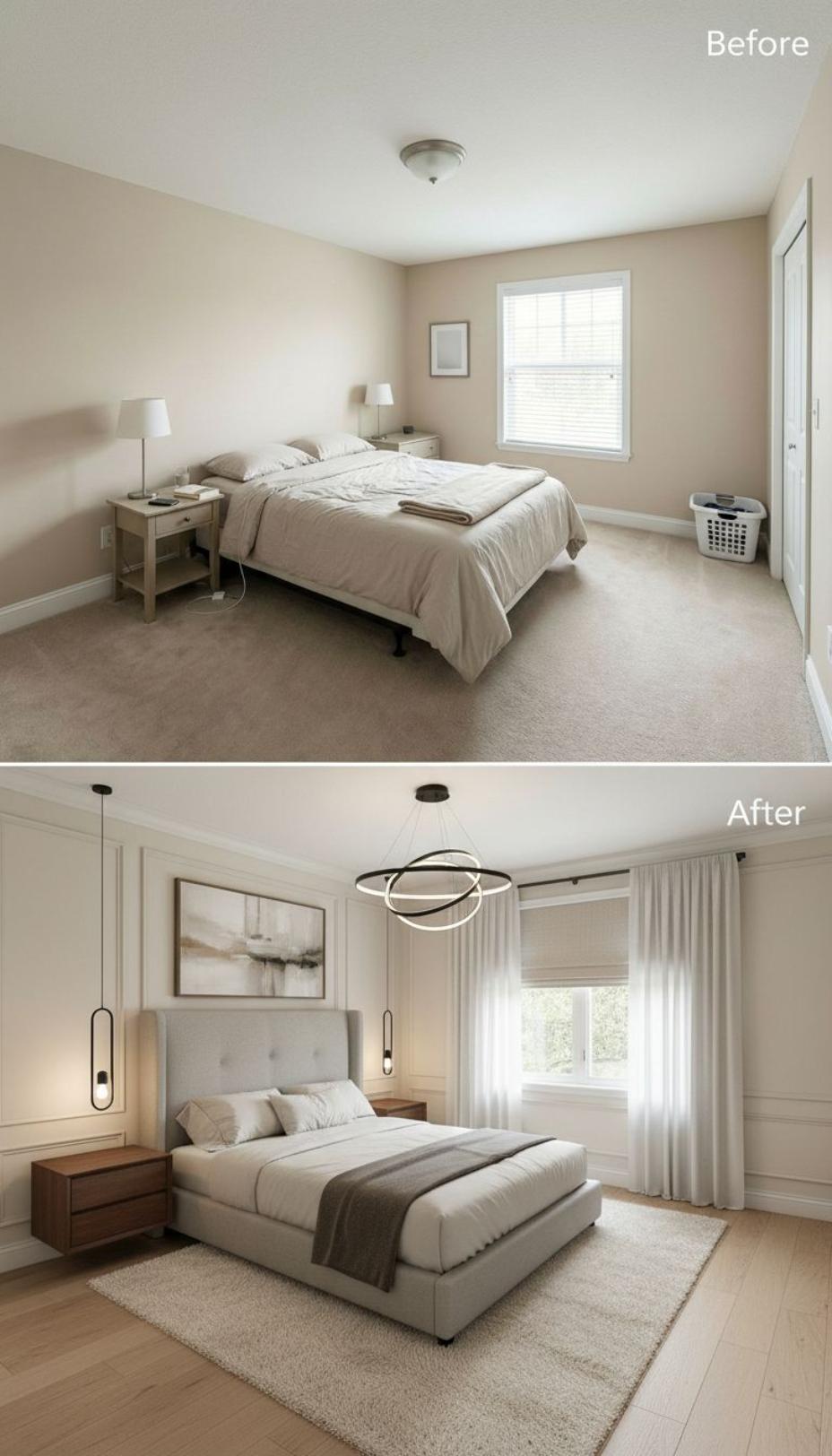 Neutral walls transform from bland to sophisticated with the addition of elegant wainscoting and modern pendant lighting. The builder grade guest bedroom evolves into a serene retreat featuring a plush upholstered platform bed, sleek floating nightstands, and layered window treatments that add depth and luxury. Contemporary sconces flanking the headboard create perfect ambient lighting while maintaining clean lines throughout the updated space.