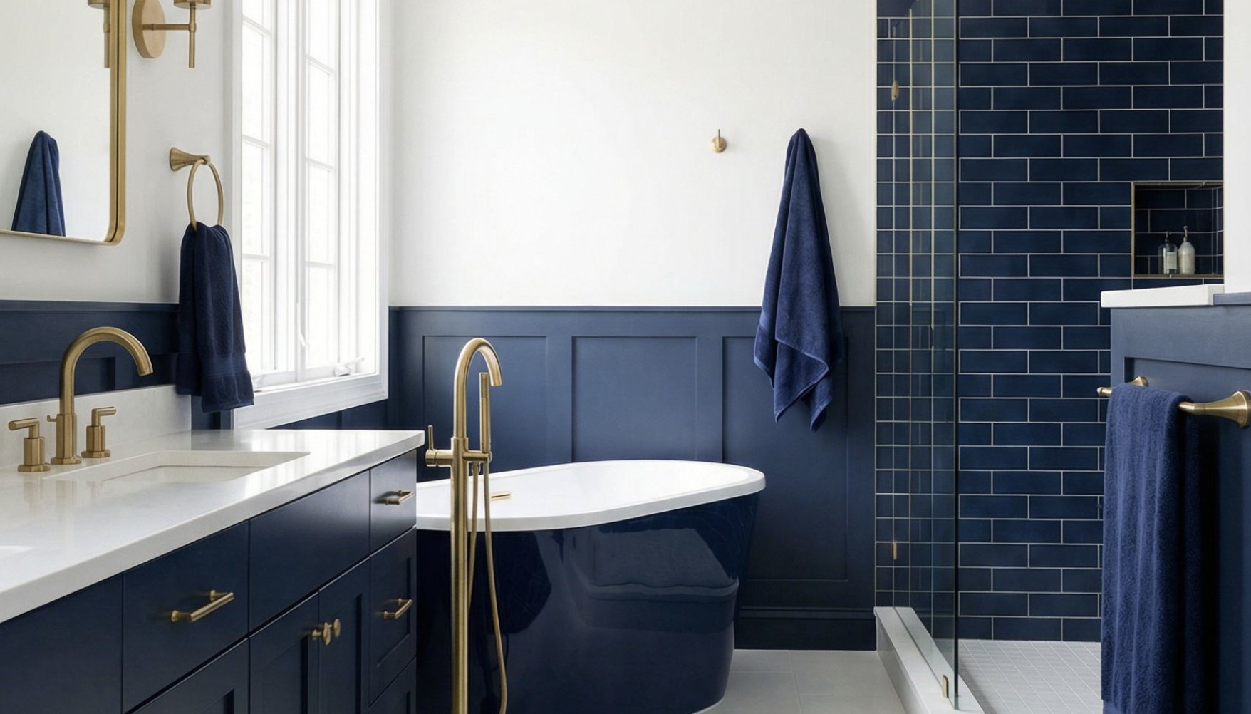 Navy blue has emerged as the sophisticated alternative to stark white in luxury bathroom design, offering a depth that transforms utilitarian spaces into emotional sanctuaries. This rich, commanding hue creates what I call “aquatic elegance”—environments that simultaneously ground and elevate the daily ritual of self-care. The following twenty-eight designs demonstrate navy’s remarkable versatility in high-end primary bathrooms.