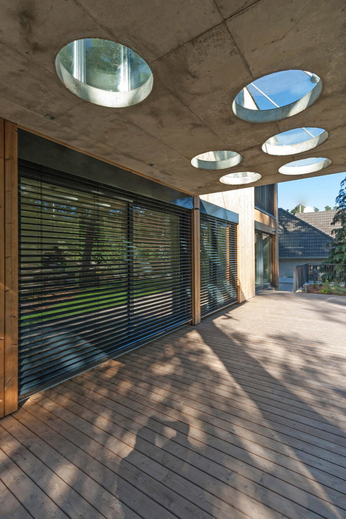 The back deck of the residence it partially covered by a concrete awning. Perfect circles have been cut out of the concrete and covered in plastic domes to allow pools of light through while protecting the residents from the elements.