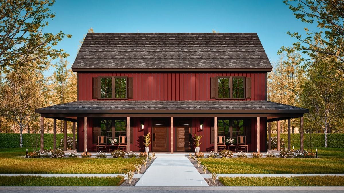 This modern farmhouse duplex presents a balanced, symmetrical exterior with clean vertical siding, a full-width covered front porch, and a simple roofline that gives the home a strong, composed presence. Warm wood accents at the entry add contrast and help define each unit while keeping the overall look cohesive and restrained.
