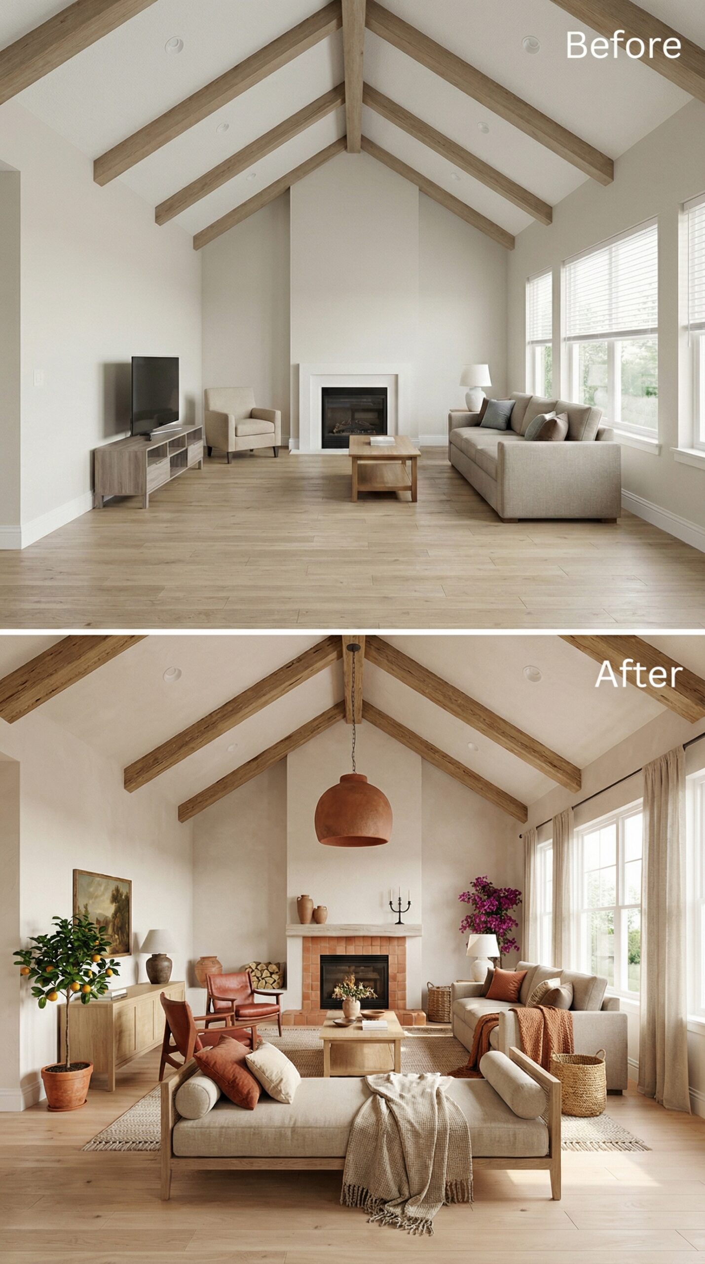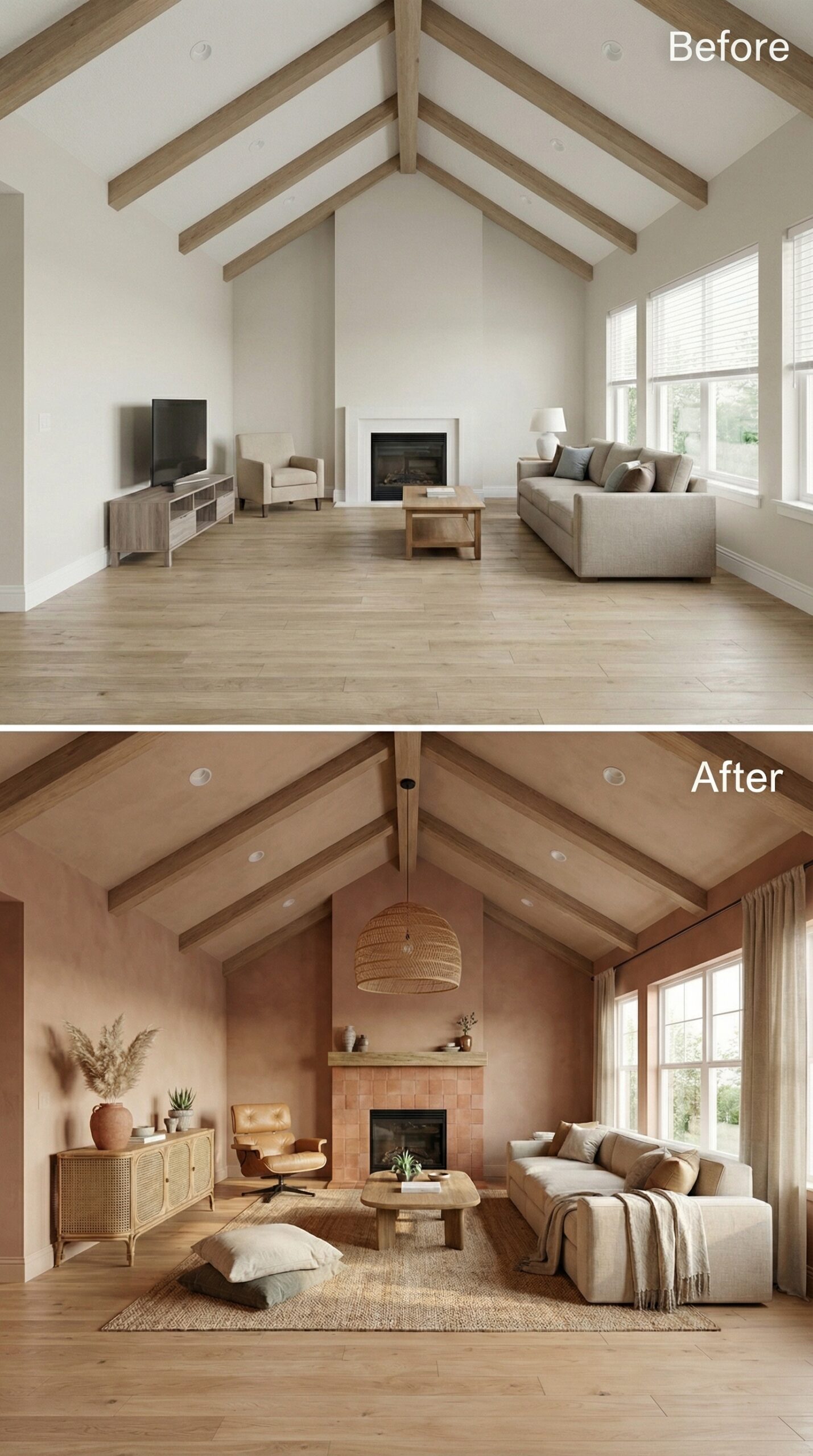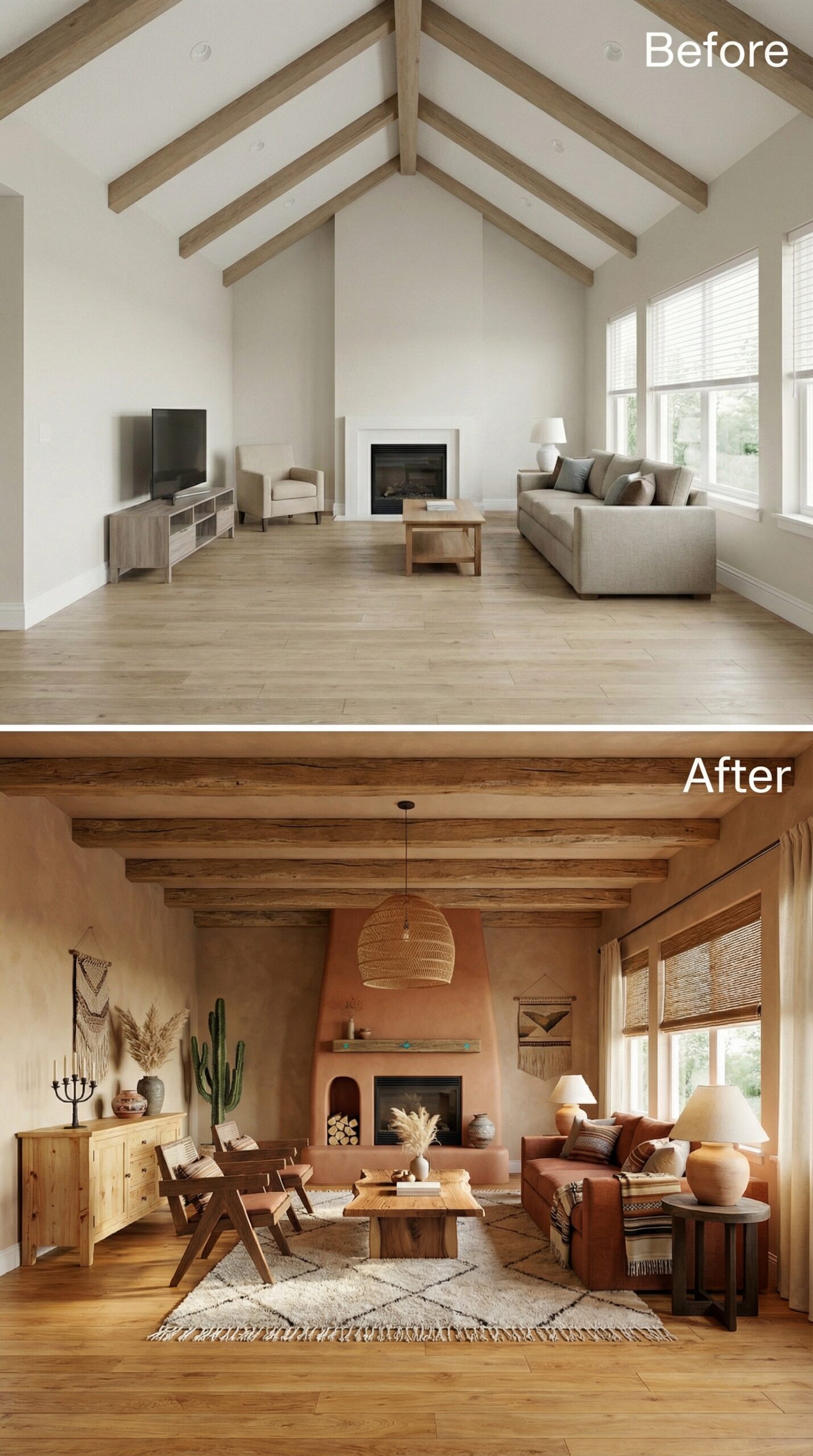 Natural wood beams frame this stunning transformation where earthy terracotta and warm honey tones replaced the original stark white palette. Mid-century leather seating pairs beautifully with woven textures and desert-inspired accessories, while the fireplace gained dramatic impact with rich clay-colored paint. Layered lighting from woven pendants and ceramic table lamps creates intimate ambiance throughout the reimagined space.